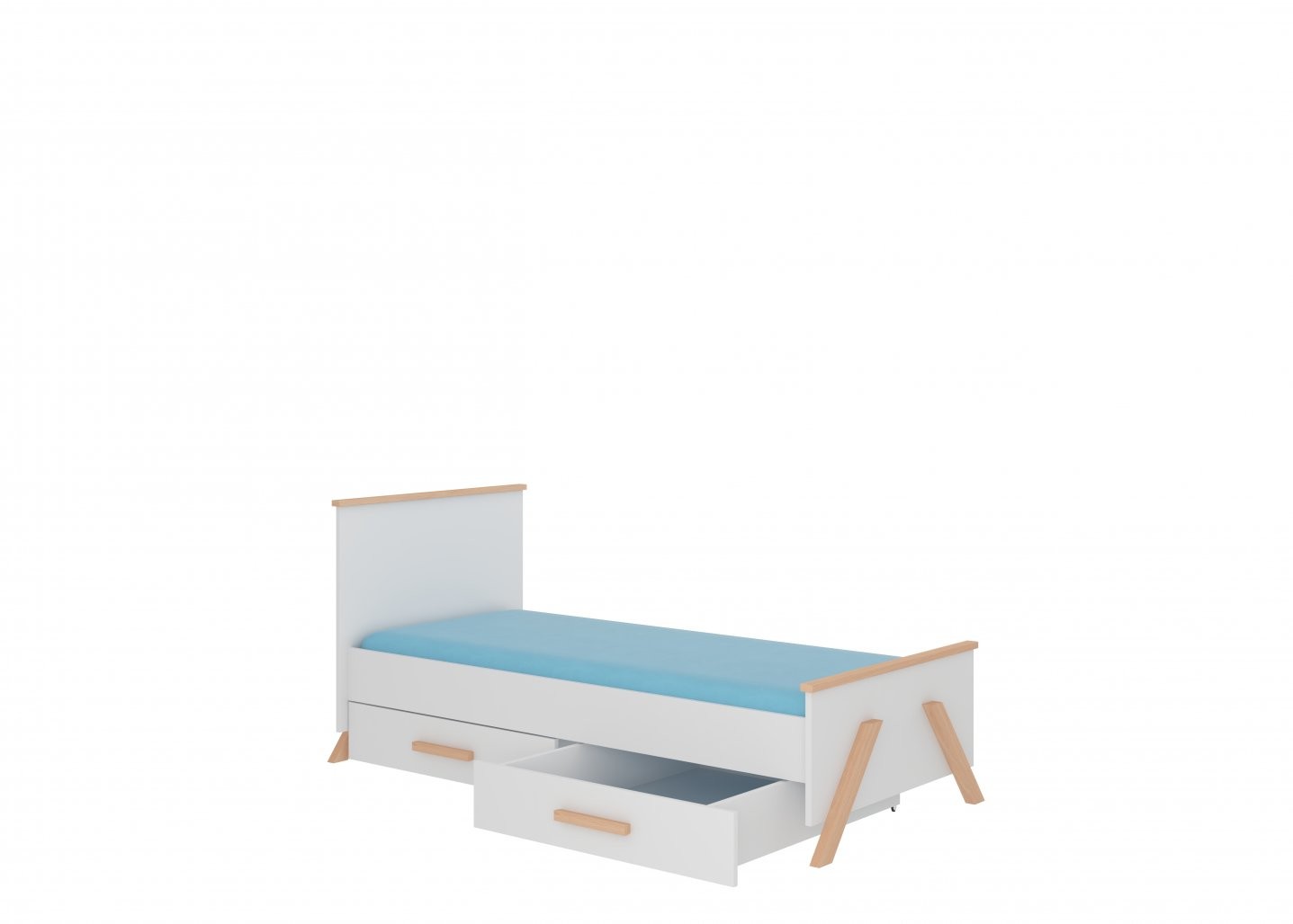 Enoposteljna postelja KORAL 200x90 je idealna izbira za mladinske in otroške sobe. S svojim sodobnim dizajnom v mat beli barvi z lesenimi dodatki iz naravnega bukovega lesa se bo odlično podala v vsak prostor. Poleg estetskega videza nudi tudi praktičnost z dvema prostornima predaloma za shranjevanje posteljnine.