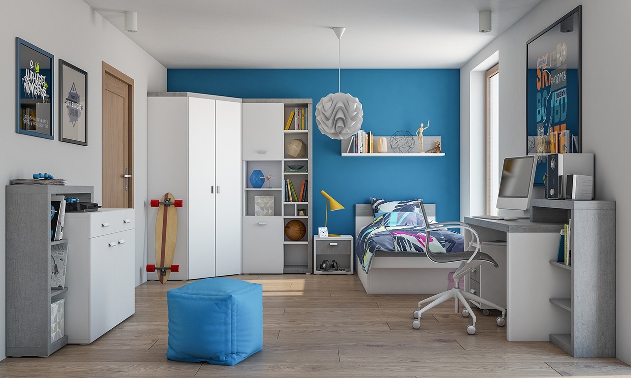 Otroška sobica CASPER je na voljo v svetli kombinaciji bele barve in Colorado betona. Svetle barve optično povečajo prostor, zato bo otroška sobica s kolekcijo CASPER izgledala bolj prostorna in zračna.
