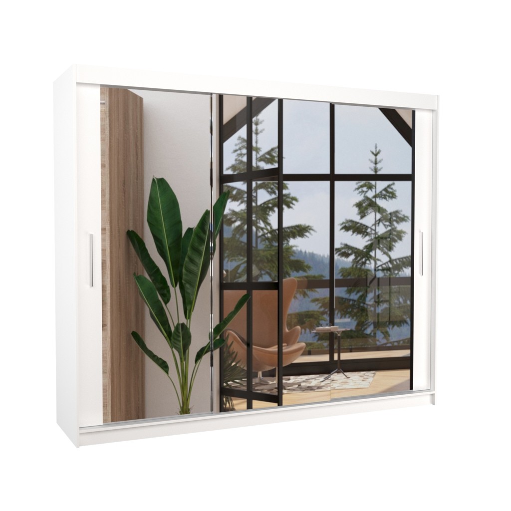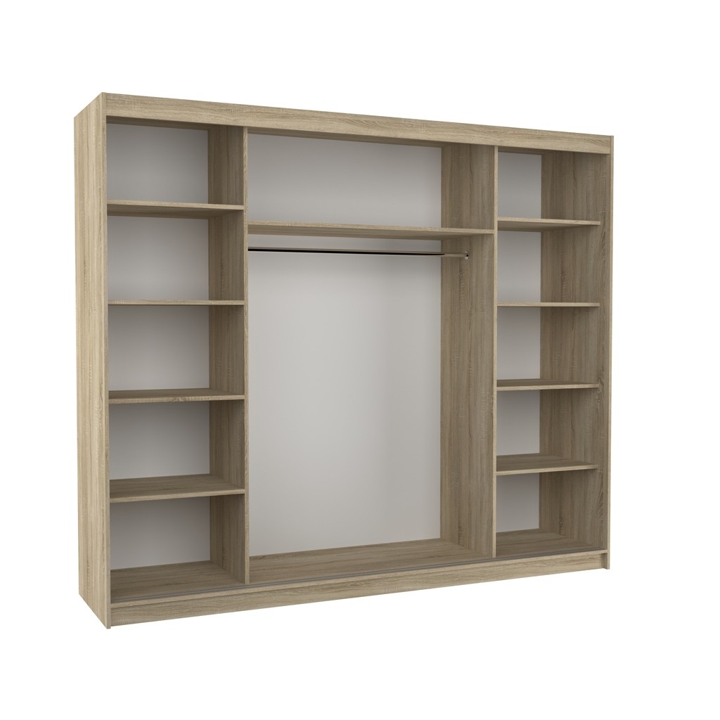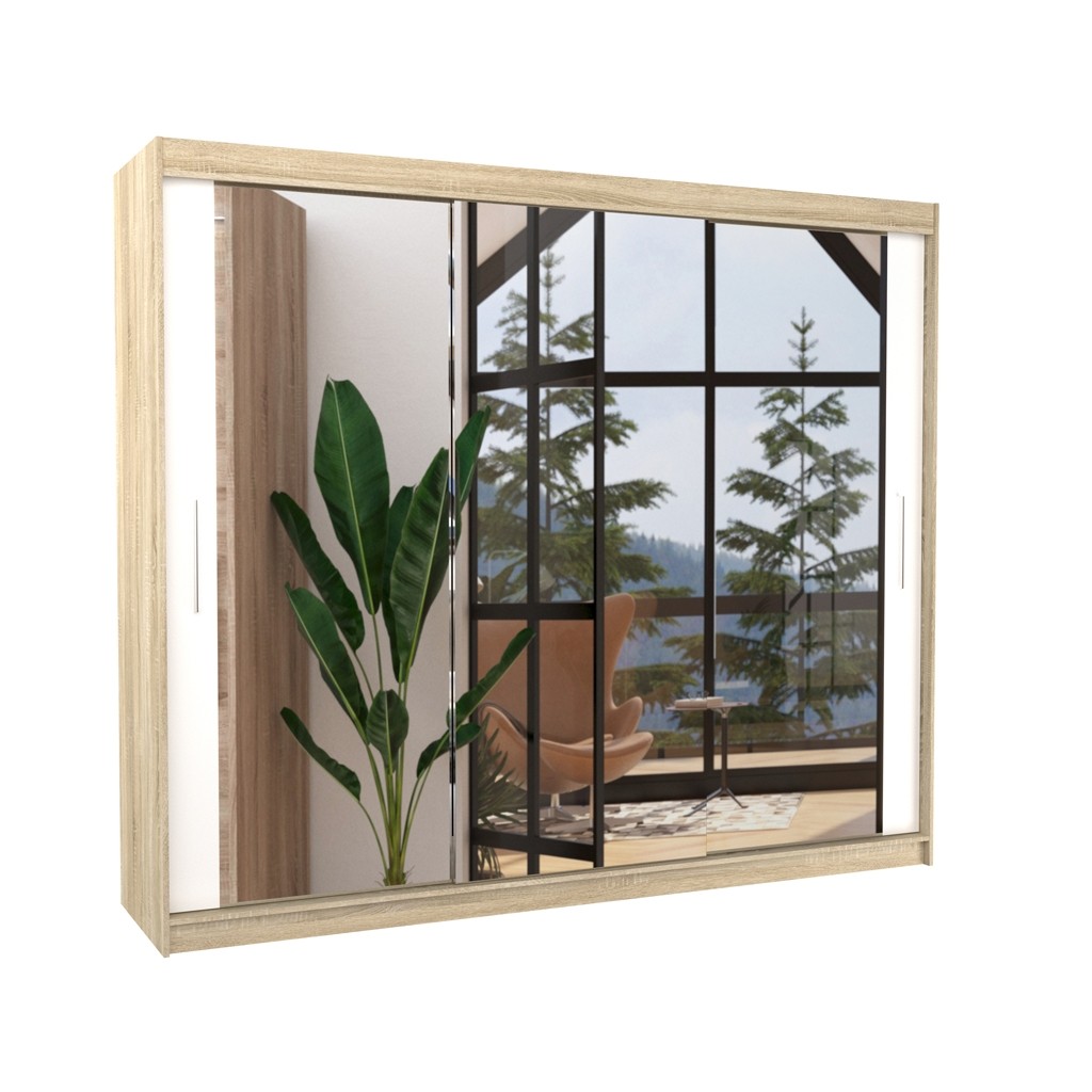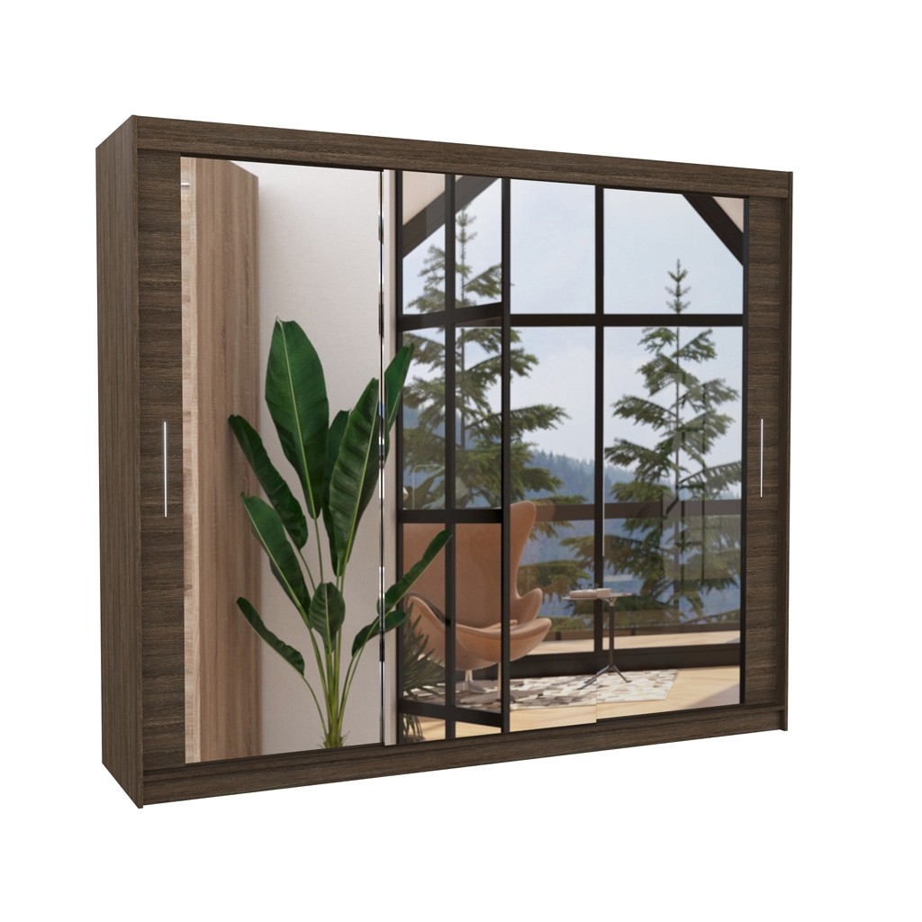 Dvodelna garderobna omara CHESTER 250 CM je primer funkcionalnosti in sodobnosti. Ta omara vsebuje drsna vrata in je popolna za tiste, ki iščejo praktično in estetsko rešitev za svoje potrebe po shranjevanju in obešanju oblačil. Omara vsebuje 9 polic in široko obešalno palico.