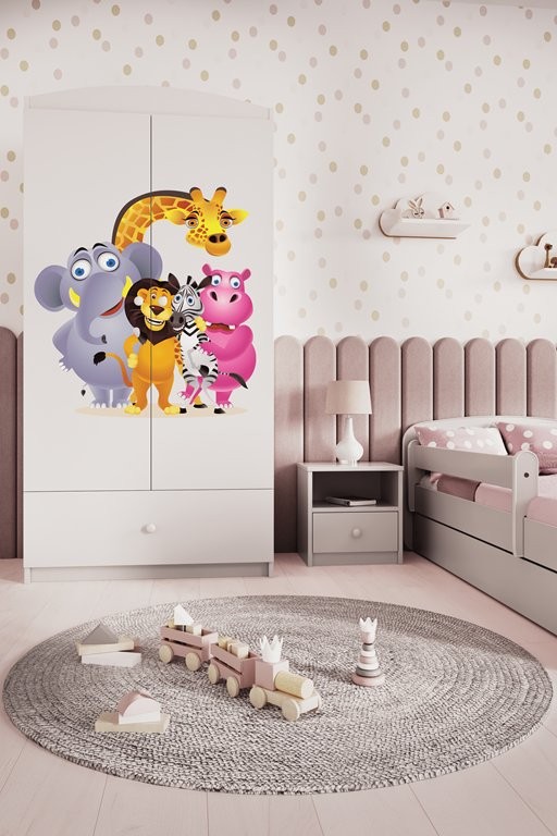 Garderobna omara Dreamy ZOO je praktična izbira za otroško sobo, saj združuje pregledno shranjevanje oblačil in drugih potrebščin v enem kosu pohištva. Na voljo je v več barvah, zato jo je lažje uskladiti z različnimi otroškimi sobami, izdelava iz oplemenitene iverne plošče v kombinaciji s kvalitetnim mediapanom pomeni brezskrbno vsakodnevno uporabo ter dolgoročno obstojnost.