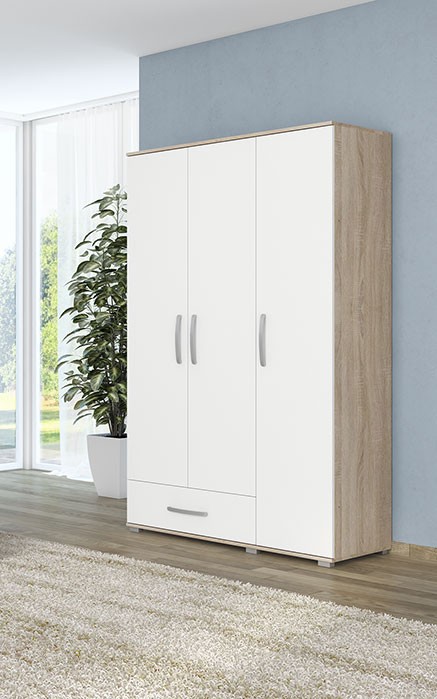 Garderobna omara EXPRESS EG31 - EKSPONAT je trodelna garderobna omara s predalom v kombinaciji bele barve in hrasta. Na širšem delu je po celi dolžini obešalna palica in nad njo polica. Na ožjem delu pa so štiri police. Je na šestih nogicah. Oglejte si še ostale elemente iz tega programa.