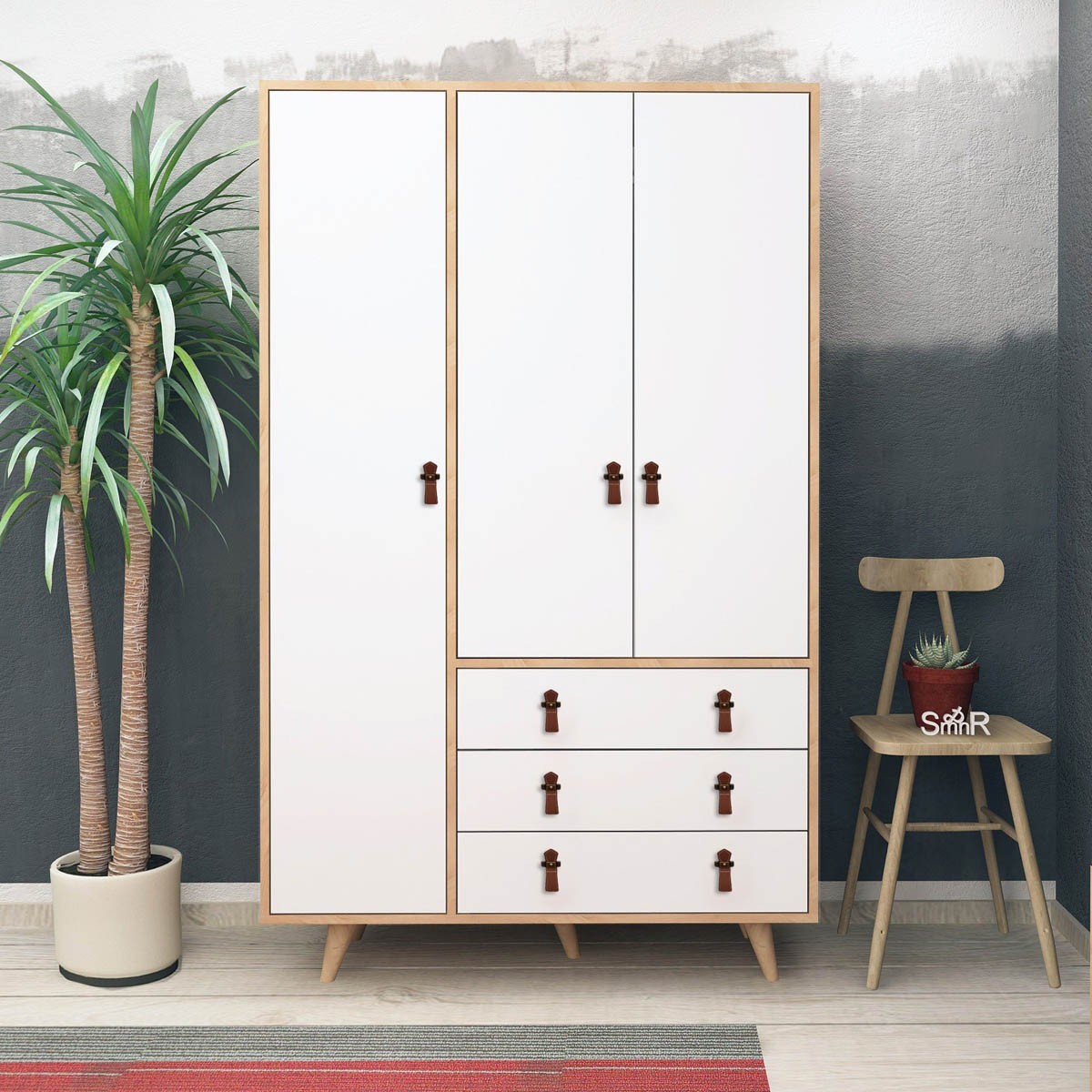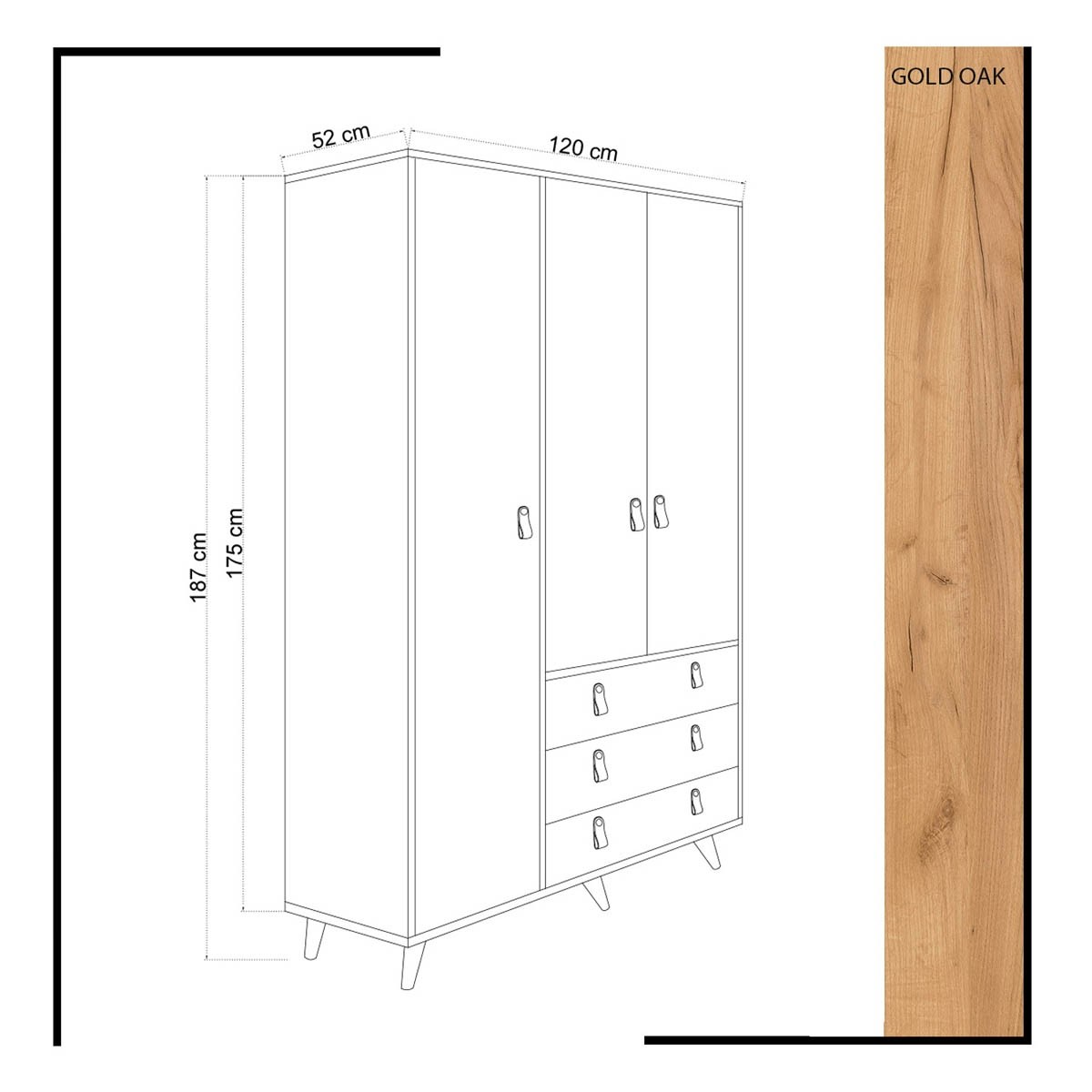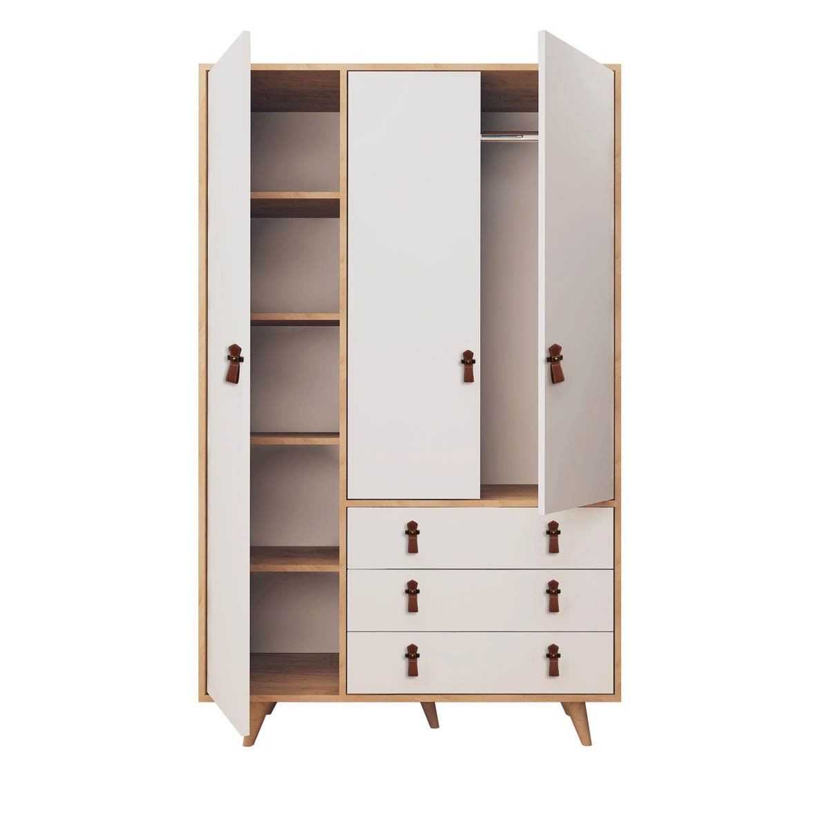 Garderobna omara FRANKY je izdelana v kombinaciji naravnega hrastovega lesa in bele barve, kar ji daje eleganten in sodoben videz. Njena praktičnost se odraža v treh predalih, ki vam omogočajo organizacijo vaših oblačil in dodatkov po vaših željah. Poleg tega pa ima tudi tri vrata, ki omogočajo dodatno shranjevanje oblačil in drugih predmetov.