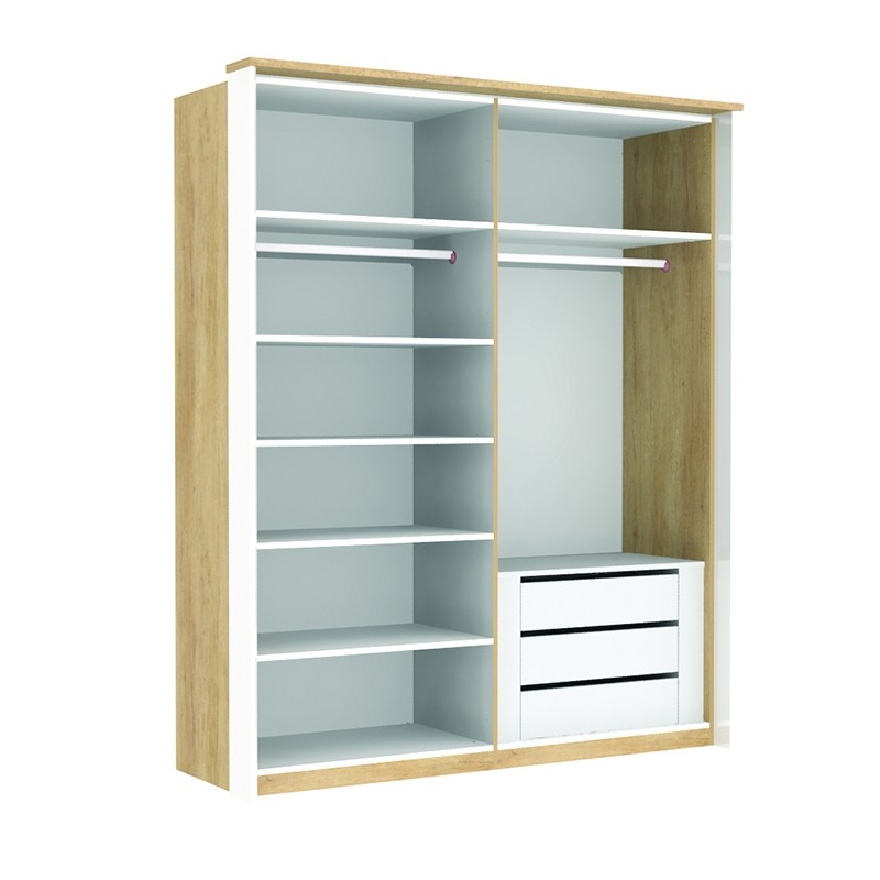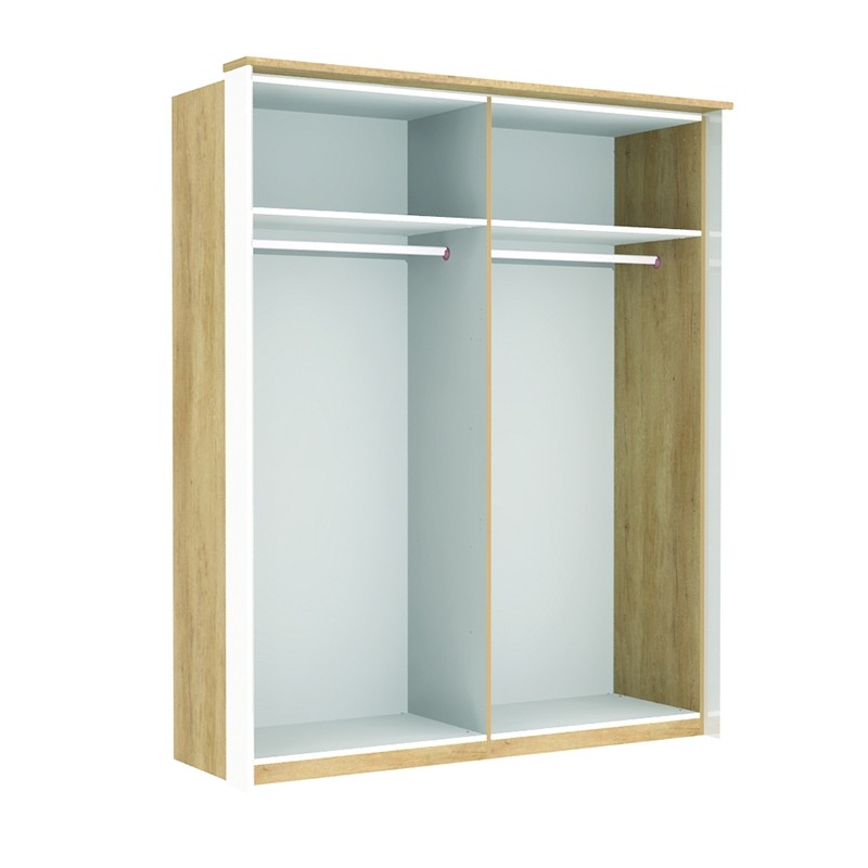 Garderobna omara Kalla Comfort z drsnimi vrati je nepogrešljiv element vsake spalnice, saj je izjemno funkcionalna. Z dodatno opremo si lahko ustvarite še bolj funkcionalno omaro, ki je prilagojena vašim potrebam. Na voljo je v barvni kombinaciji bež in nebraska hrast.