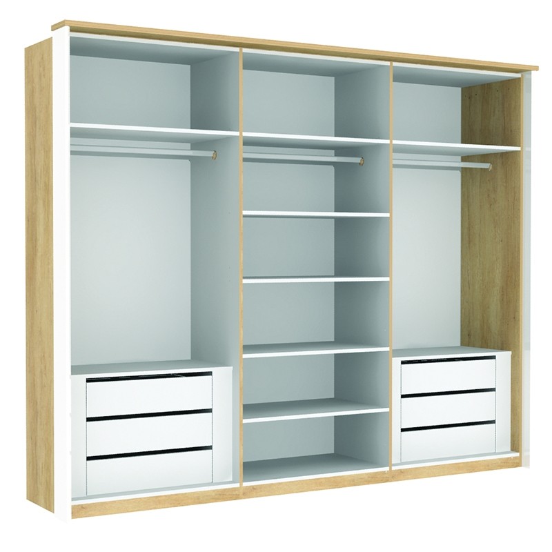 Garderobna omara Kalla Comfort z drsnimi vrati je nepogrešljiv element vsake spalnice, saj je izjemno funkcionalna. Z dodatno opremo si lahko ustvarite še bolj funkcionalno omaro, ki je prilagojena vašim potrebam. Na voljo je v barvni kombinaciji bež in nebraska hrast. Notranjost vključuje tri velike police in tri dolge palice za obešanje.