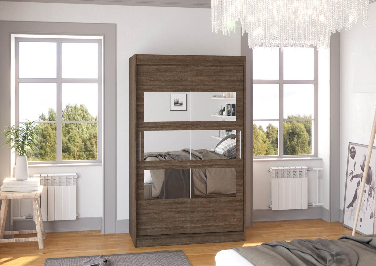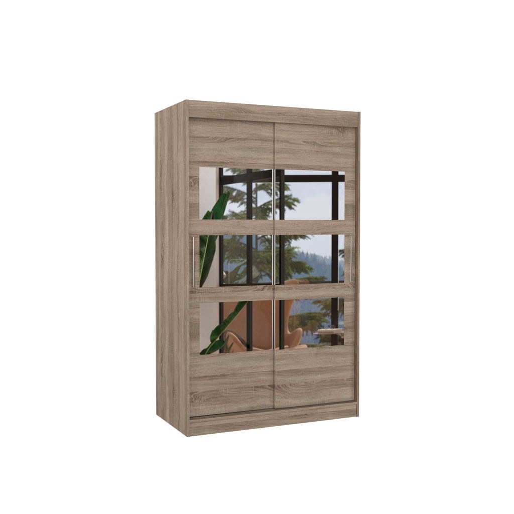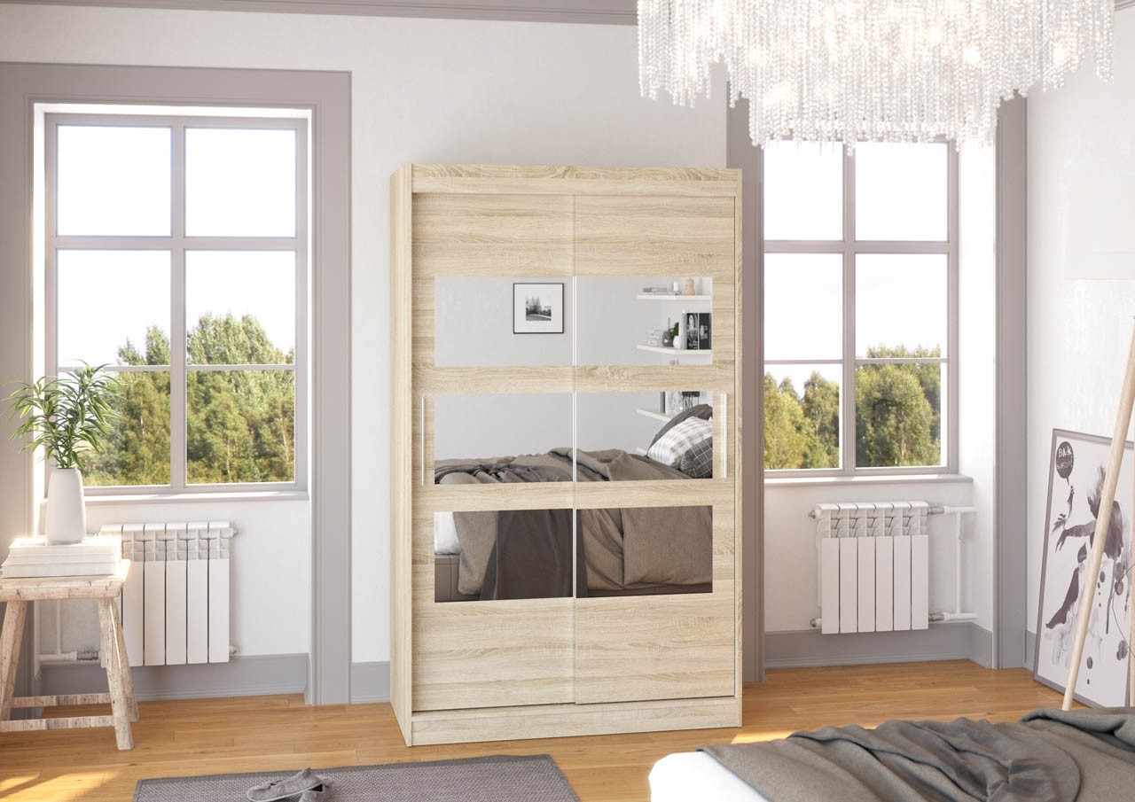 Garderobna omara KOLORADO je modernega izgleda, ki se lahko ponaša s tremi ogledali, ki so zloženi eden na drugega. V garderobni omari lahko najdete veliko polic, ki vam omogočajo shranjevalni prostor in pa obešalno palico na katero lahko obesite srajce ali večerne obleke.