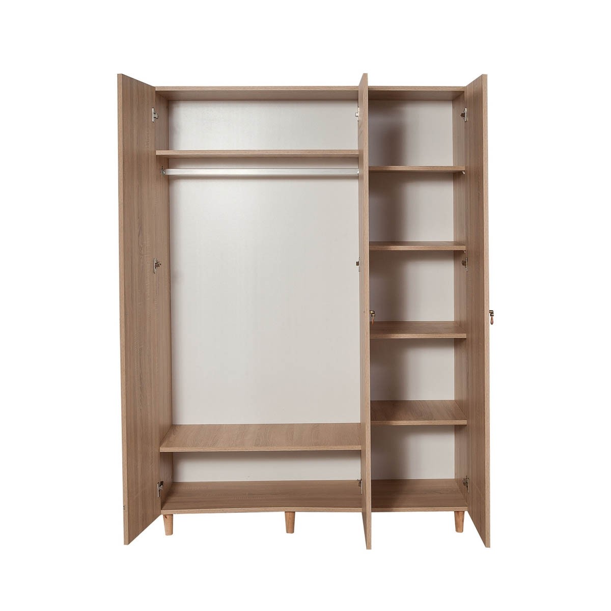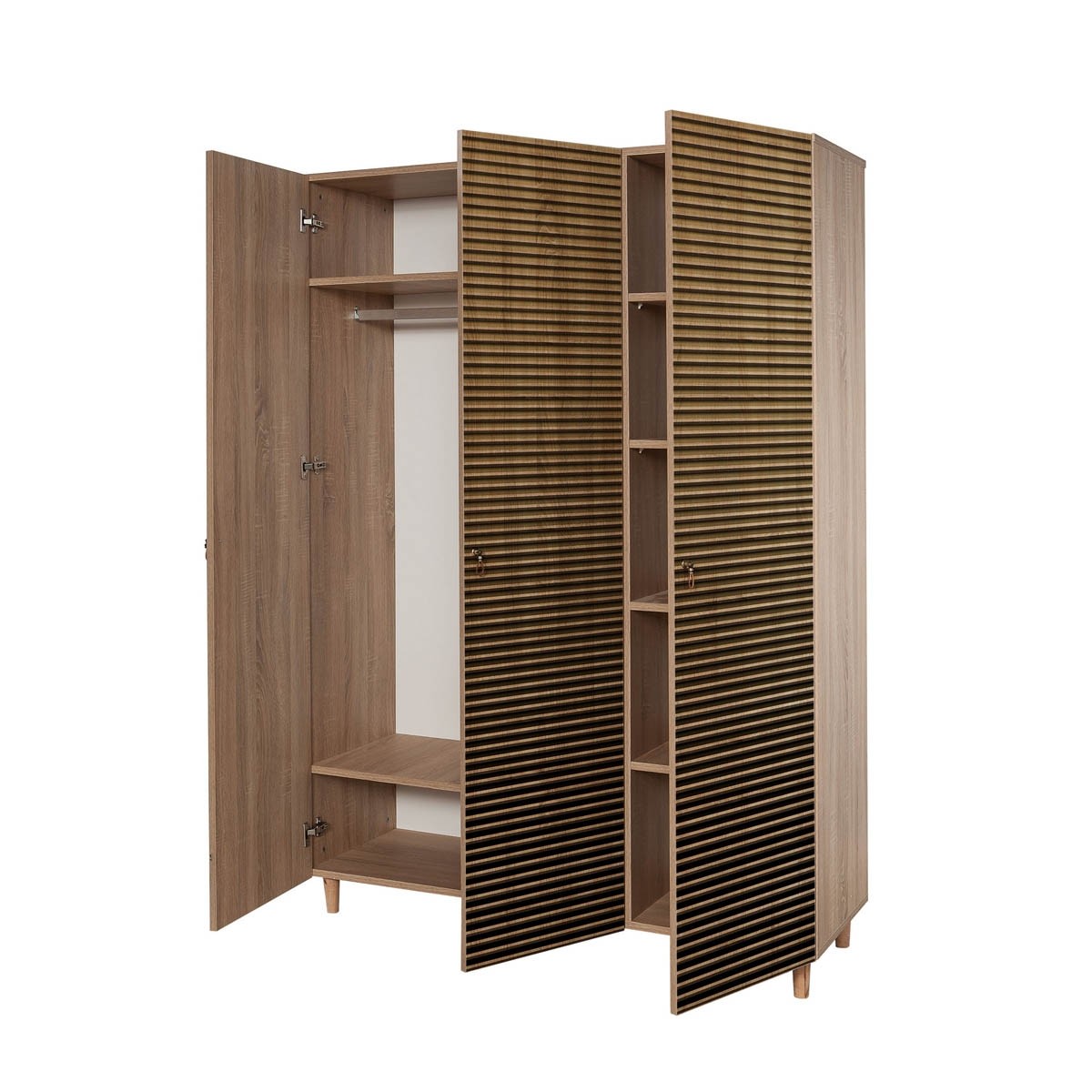 Garderobna omara MODE je popoln dodatek k vaši spalnici. Zasnovana je v modernem slogu, z rebrastimi vrati, ki dodajo poseben čar. Na voljo so tri vrata, ki vam omogočajo enostaven dostop do vašega garderobnega prostora. V notranjosti se skrivajo različne police in obešalniki, ki vam pomagajo organizirati vašo garderobo.