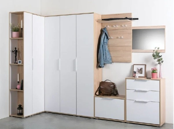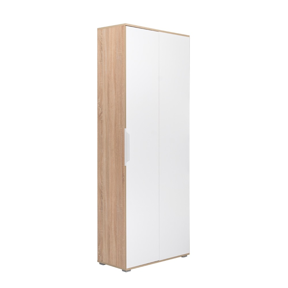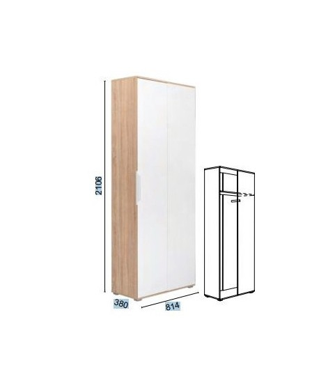 Garderobna omara TALAS 10 se bo odlično podala v vsako predsobo, saj je globoka samo 38 cm, in nudi veliko prostora za shranjevanje večjih predmetov kot so sesatlec, metla, in podobno. Klasična kombinacija bele barve in korpusa v sonoma hrast barvi se lepo poda v vsak prostor. Dvojna vrata so preklopna in se odpirajo s kovinskimi ročaji, v notranjosti omare pa je ena fiksna polica z nosilnostjo 3kg.