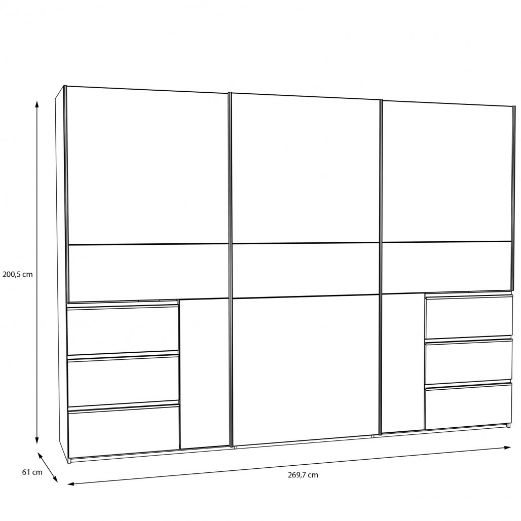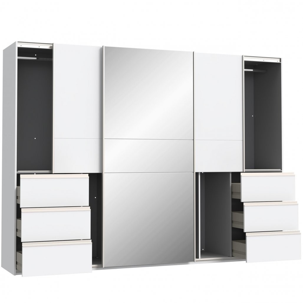 Velika tridelna garderobna omara, na voljo v beli barvi s sredinskim ogledalom ali v kombinaciji hrasta in temno sive barve.