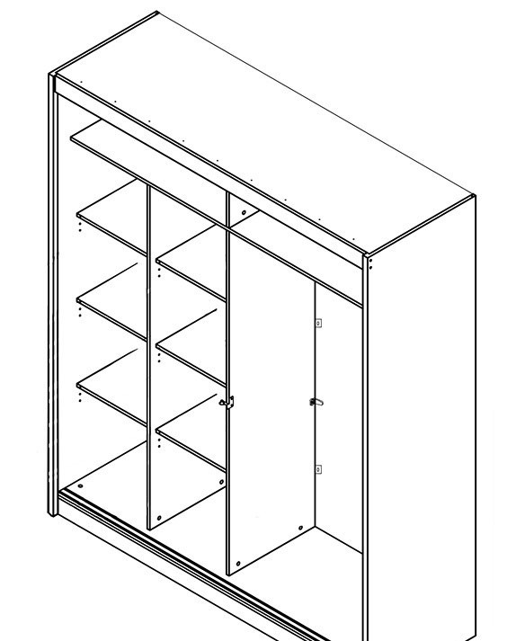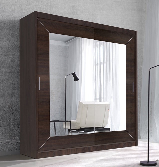 Garderobna omara z drsnimi vrati in ogledalom Alfa (temna sonoma hrast) v širini 180 cm je prostorna omara z izredno praktično postavitvijo polic in palic za obešanje. Garderobno omaro odlikuje sodoben izgled z velikim ogledalom v sredini ter temno sonoma hrast barvo. Notranjost omare je sestavljena iz dveh delov. Prva polovica vsebuje zgornjo polico ter palico za obešanje. Druga polovica vsebuje zgornjo polico ter 8 enako velikih blokov.