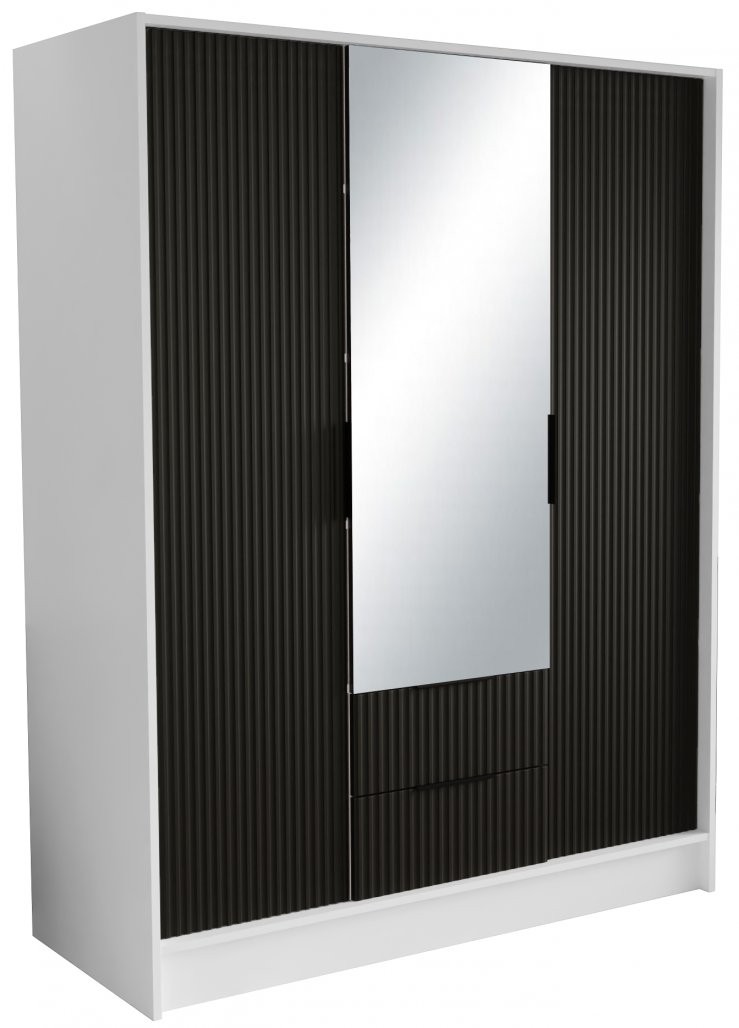 Garderobna omara z ogledalom Norel 150 cm (bela/črna) je elegantna in sodobna rešitev za shranjevanje vaših oblačil in dodatkov. Z valovito strukturo in velikim ogledalom doda prostoru globino in funkcionalnost. Omara je na voljo v več barvnih kombinacijah in dimenzijah, kar omogoča popolno prilagoditev vašim željam.