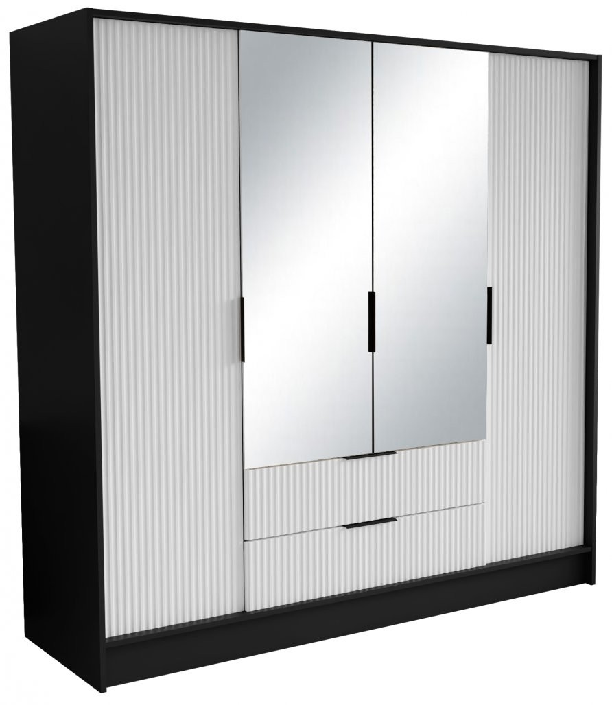 Garderobna omara z ogledalom Norel 200 cm (črna/bela) je elegantna in sodobna rešitev za shranjevanje vaših oblačil in dodatkov. Z valovito strukturo in velikim ogledalom doda prostoru globino in funkcionalnost. Omara je na voljo v več barvnih kombinacijah in dimenzijah, kar omogoča popolno prilagoditev vašim željam.