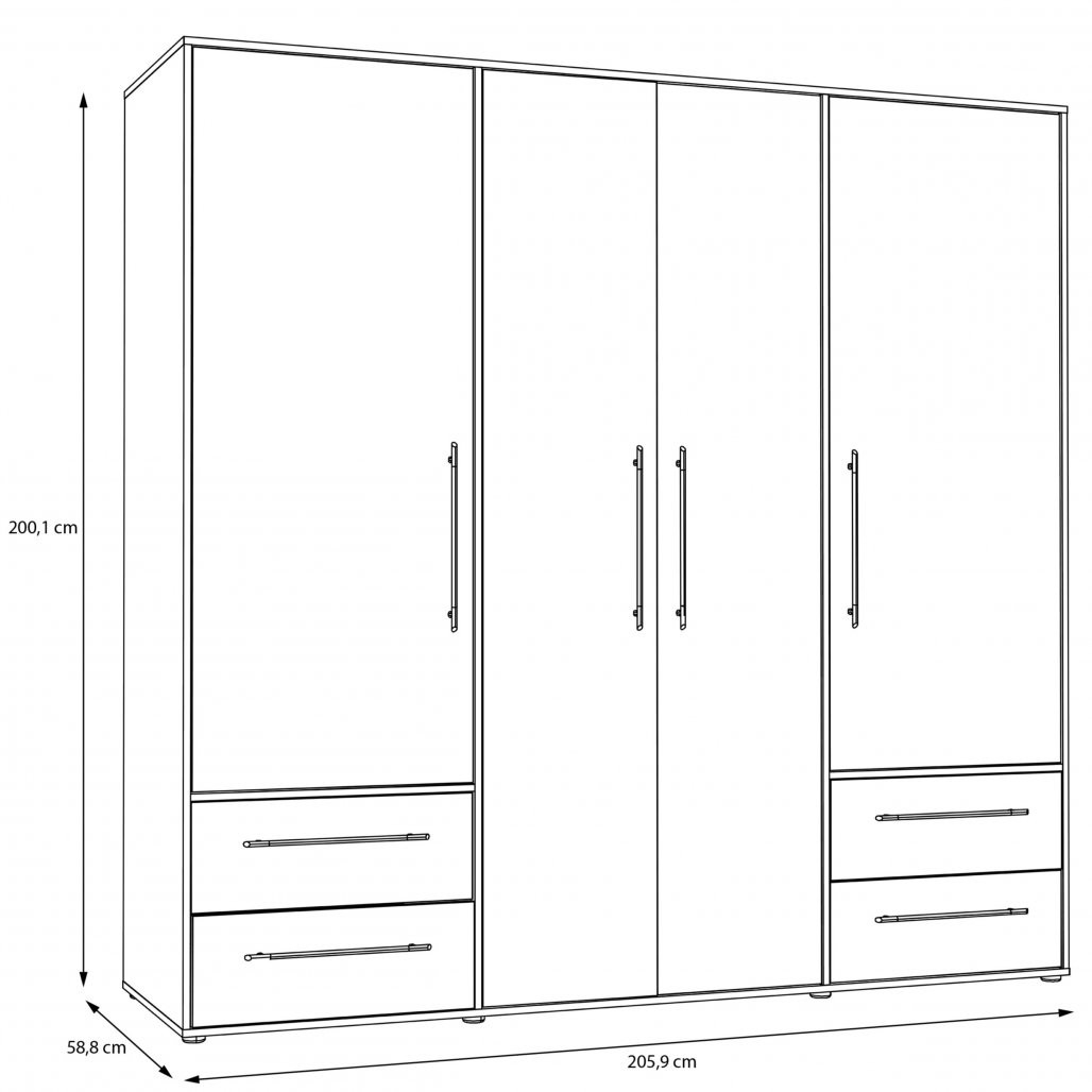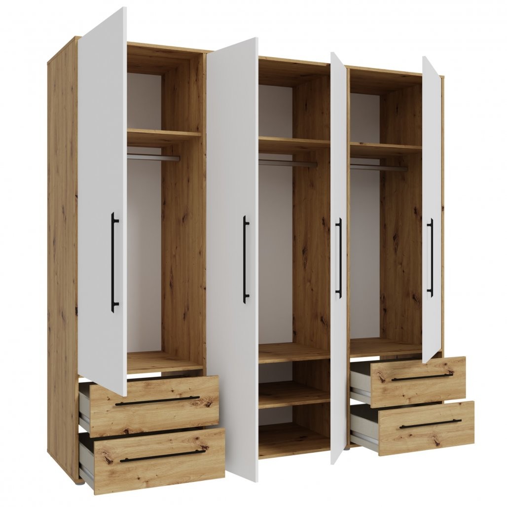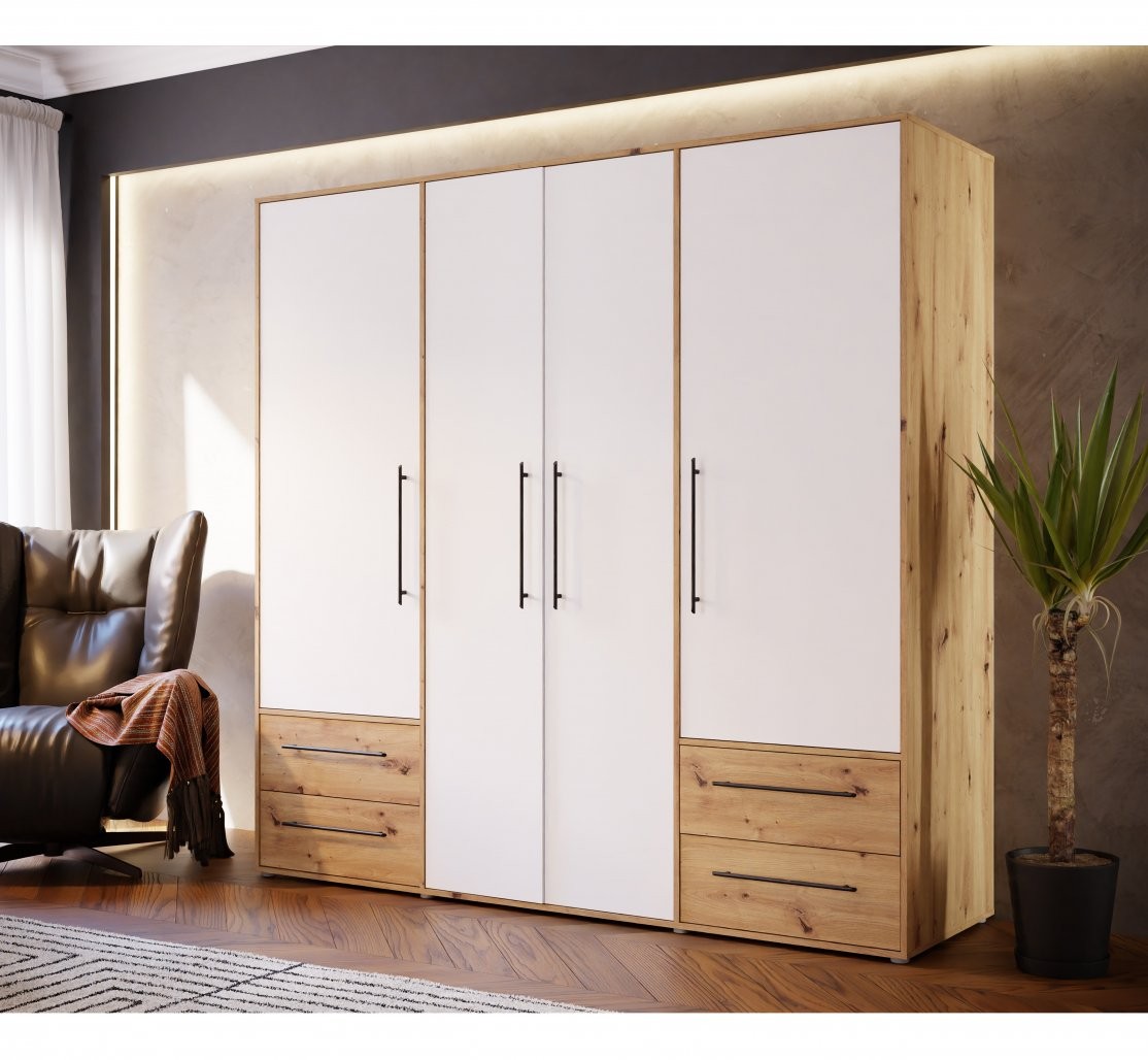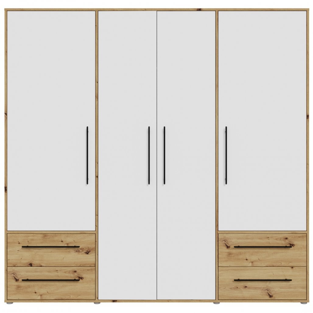 Velika tridelna garderobna omara s štirimi vrati in štirimi predali, na voljo z ohišjem v barvi hrasta ter vrati v beli barvi