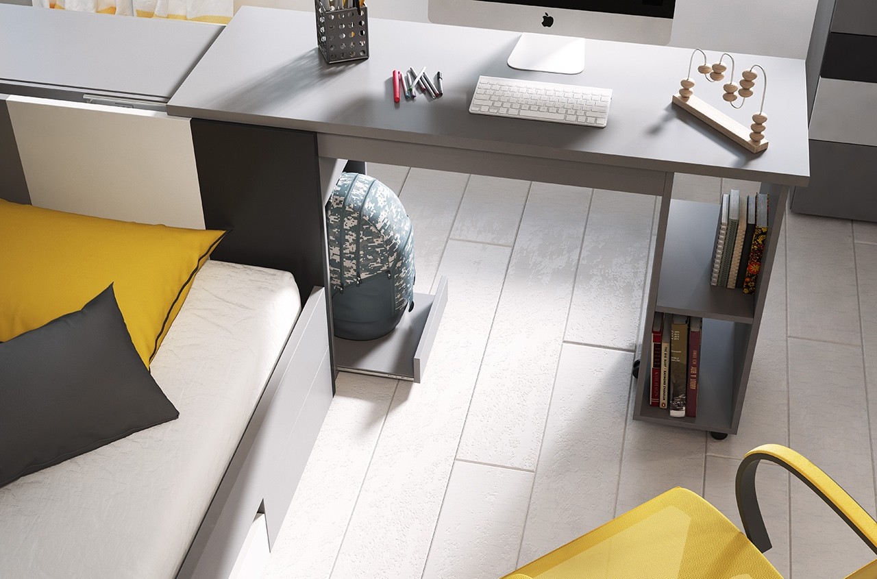 Elegantna kombinacija srebrne, sive in črne barve nudi pohištvu nekoliko bolj prefinjen videz, zato je kolekcija Tomi primerna tako za otroško kot tudi za mladinsko sobo. Enostaven dizajn in nekoliko temnejše barve naredijo sobo primerno za vse starosti!