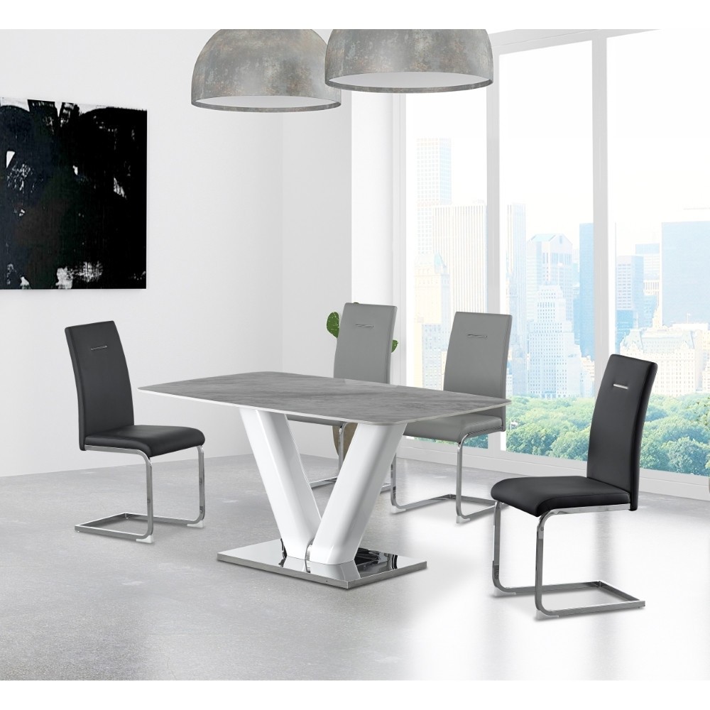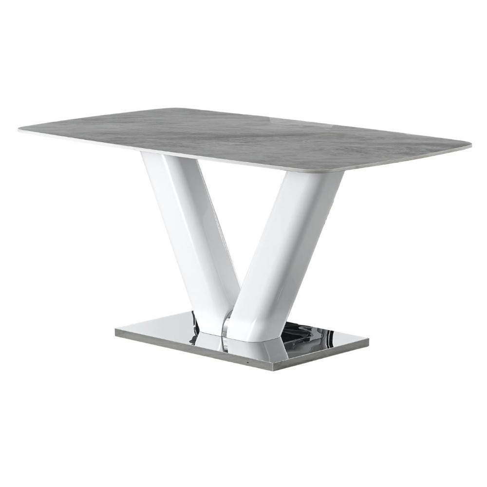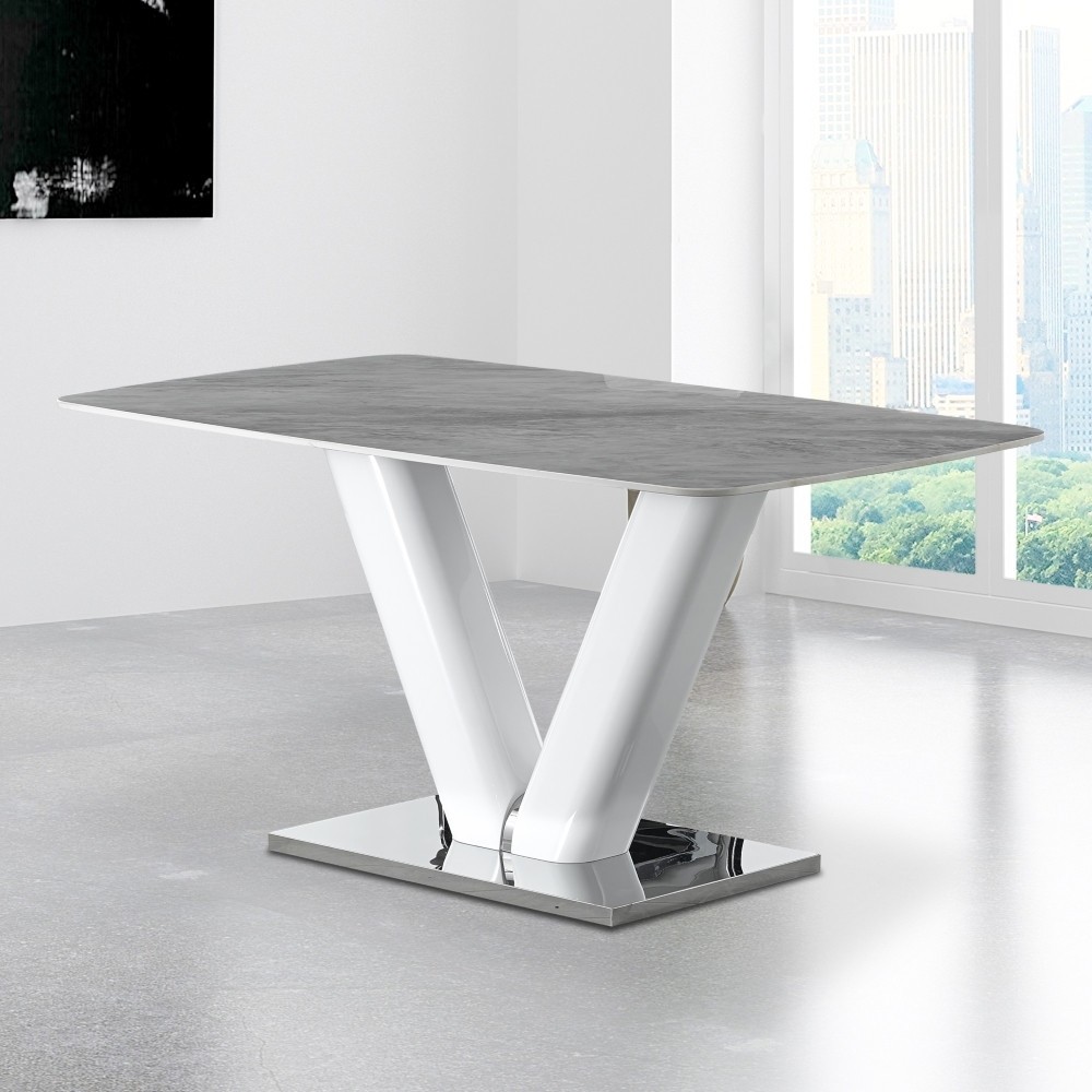 Sintrani kamen je izdelan iz kombinacije več naravnih kamnov v različnih barvah, kar mu daje izjemno trdnost in vzdržljivost. V primerjavi z običajnimi keramičnimi ploščami je močnejši in bolj odporen proti poškodbam. Višina mize je 76 cm, kar omogoča udobno sedenje in prileganje večini jedilnih stolov. Nosilna stebra mize sta izdelana iz kakovostnega MDF materiala v beli barvi, kar ustvarja čudovit kontrast s sivo mizno ploščo.