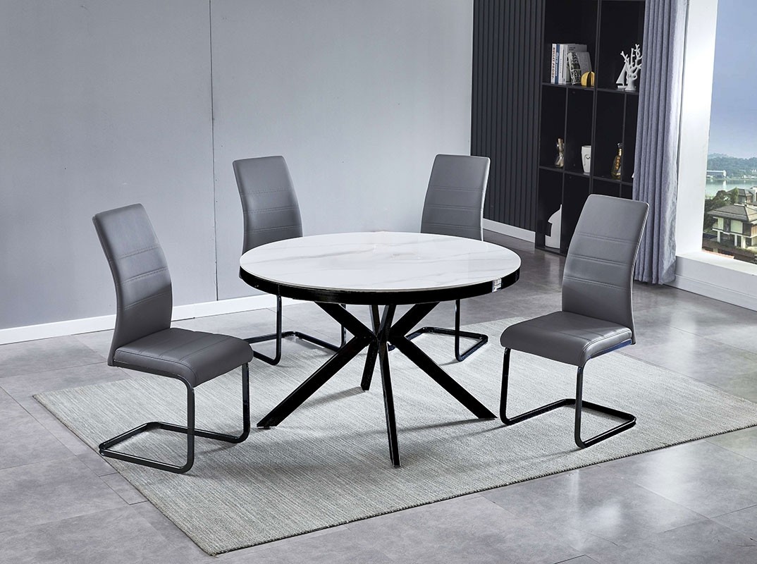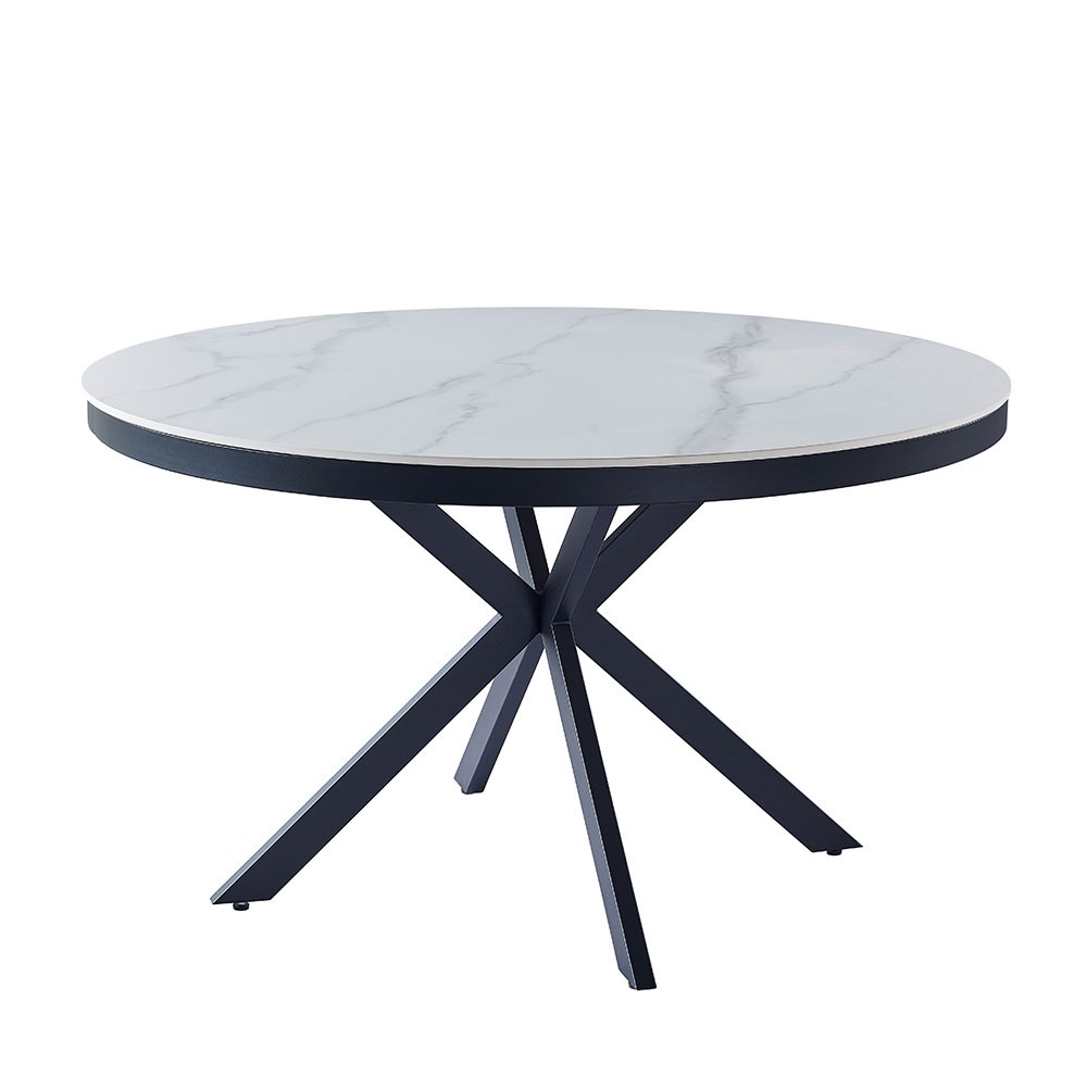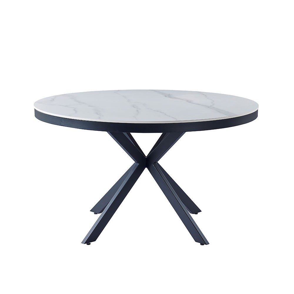 Jedilna miza REHEN 1 je na voljo v beli barvi in je premera 120 cm. Namizna plošča je izdelana iz sintranega kamna bele barve, debeline 12mm. Plošča stoji na črnih kovinskih nogicah. Sintrani kamen je načeloma močnejši in se težje razbije, pravtako pa je prijeznejši okolju od kemično obdelanih kremenčevih plošč.