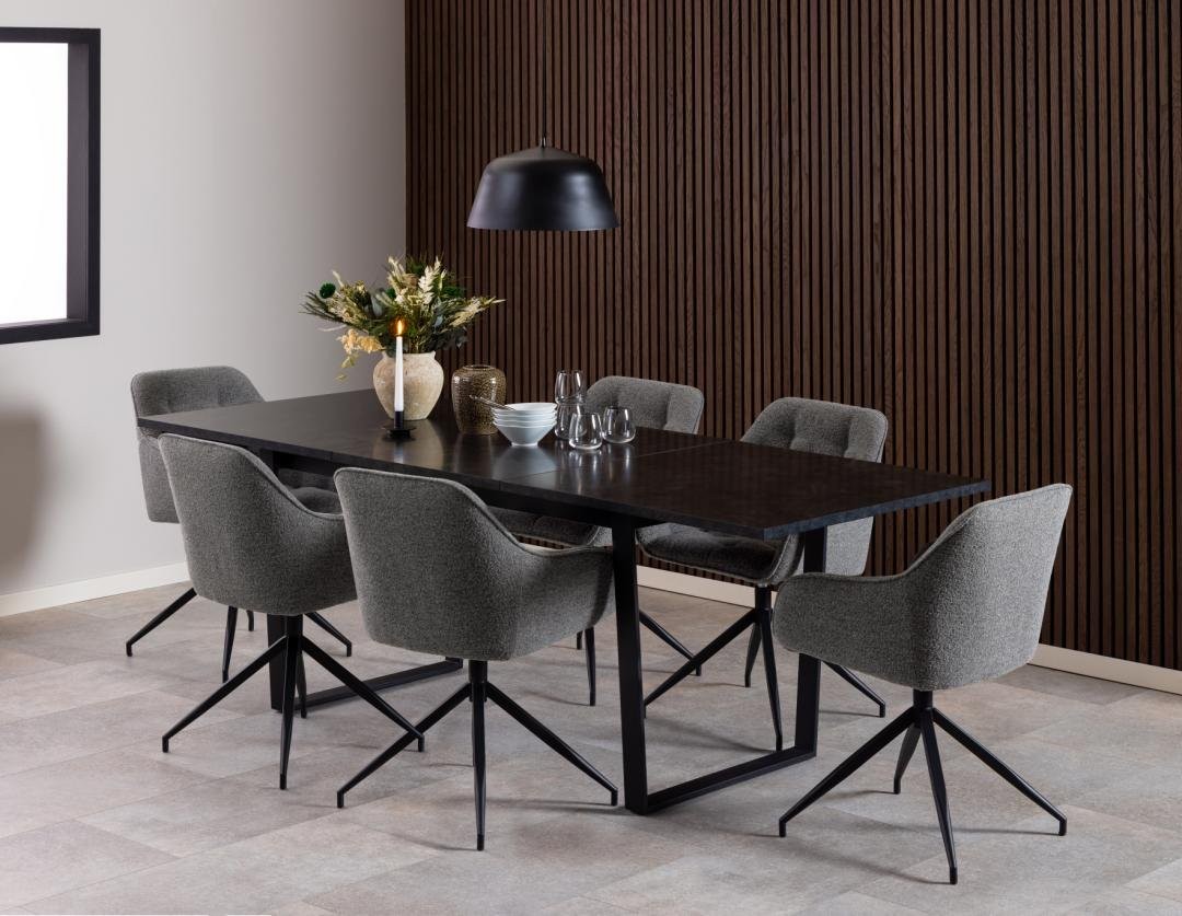 S poudarkom tako na estetiki kot na praktičnosti bo jedilna miza SOTERIS hitro postala vaš favorit. Pravokotna zgornja površina je v imitiaciji črnega marmorja, ki mizi daje sodoben izgled. Zahvaljujoč mehanizmu za razširitev "metuljček" se zgornja površina lahko enostavno razširi.