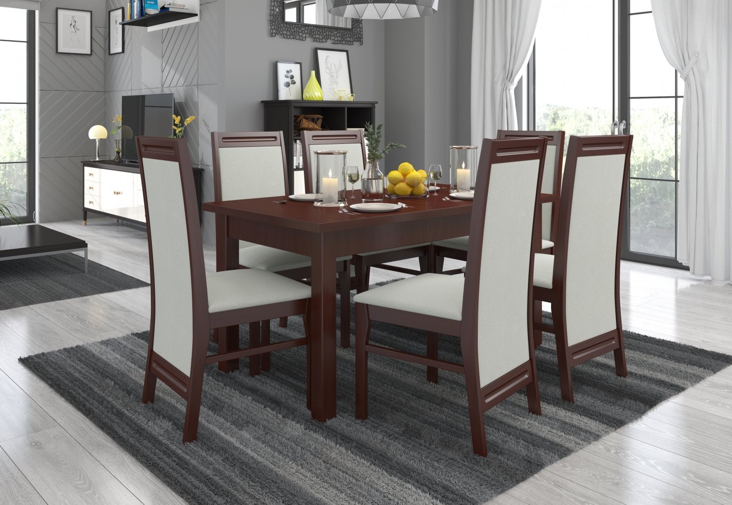Jedilni komplet RODOS 7 je odlična izbira za vse, ki iščejo eleganten in funkcionalen komplet za svojo jedilnico. Sestavljen je iz ene trpežne mize in šestih udobnih stolov, ki omogočajo prijetno sedenje za vso družino ali goste.