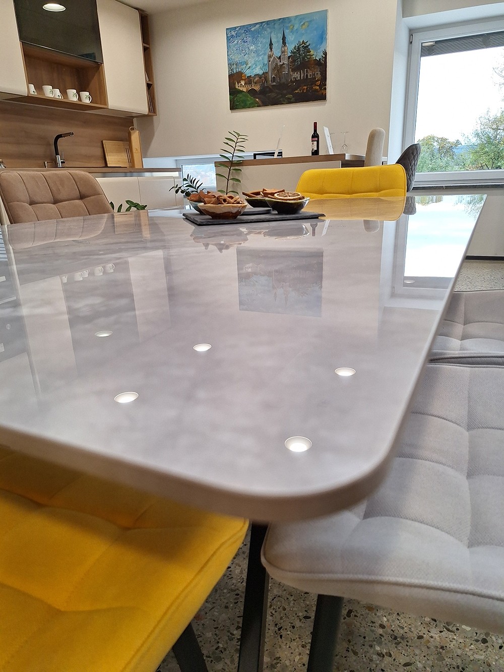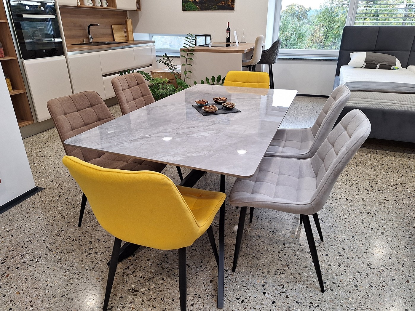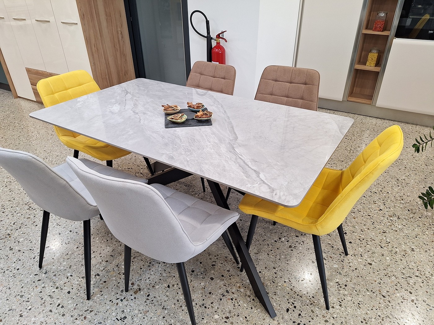 Elegantna in predvsem moderna jedilna miza na voljo v barvi sivega marmorja bo vaš jedilni prostor posvetlila in modernizirala. Miza je primerna za vsakogar, saj njegova nevtralna siva barva omogoči, da mizo postavimo v vsak jedilni prostor. Odporna je na mraz in vročino, kar samo še doda kvaliteti te mize. Plošča mize je narejena iz sintranega kamna, ki je bolj kvaliteten od navadne keramike. Noge, ki se inovativno prepletajo so narejene iz kovinskih cevi. Maksimalna obremenitev mize je 120 kg.