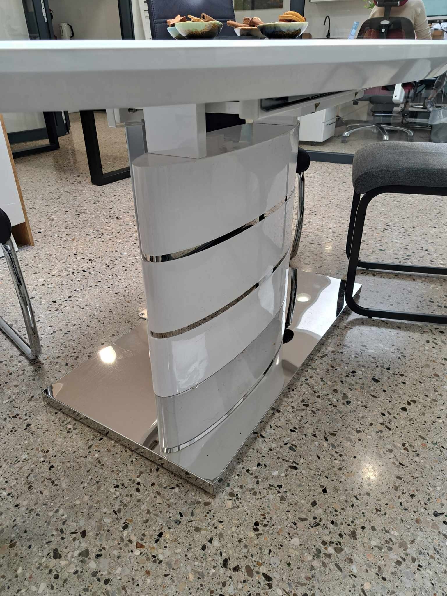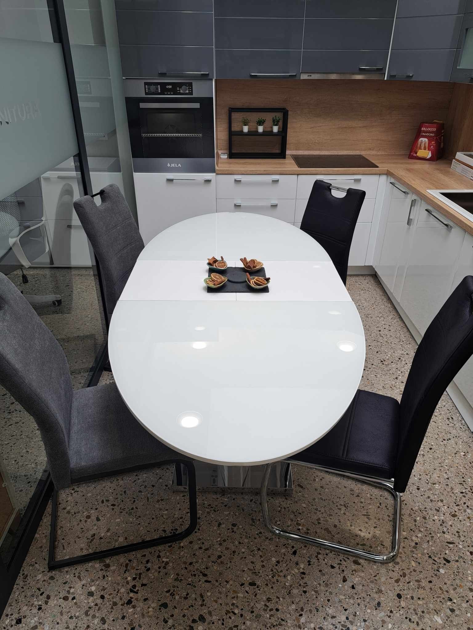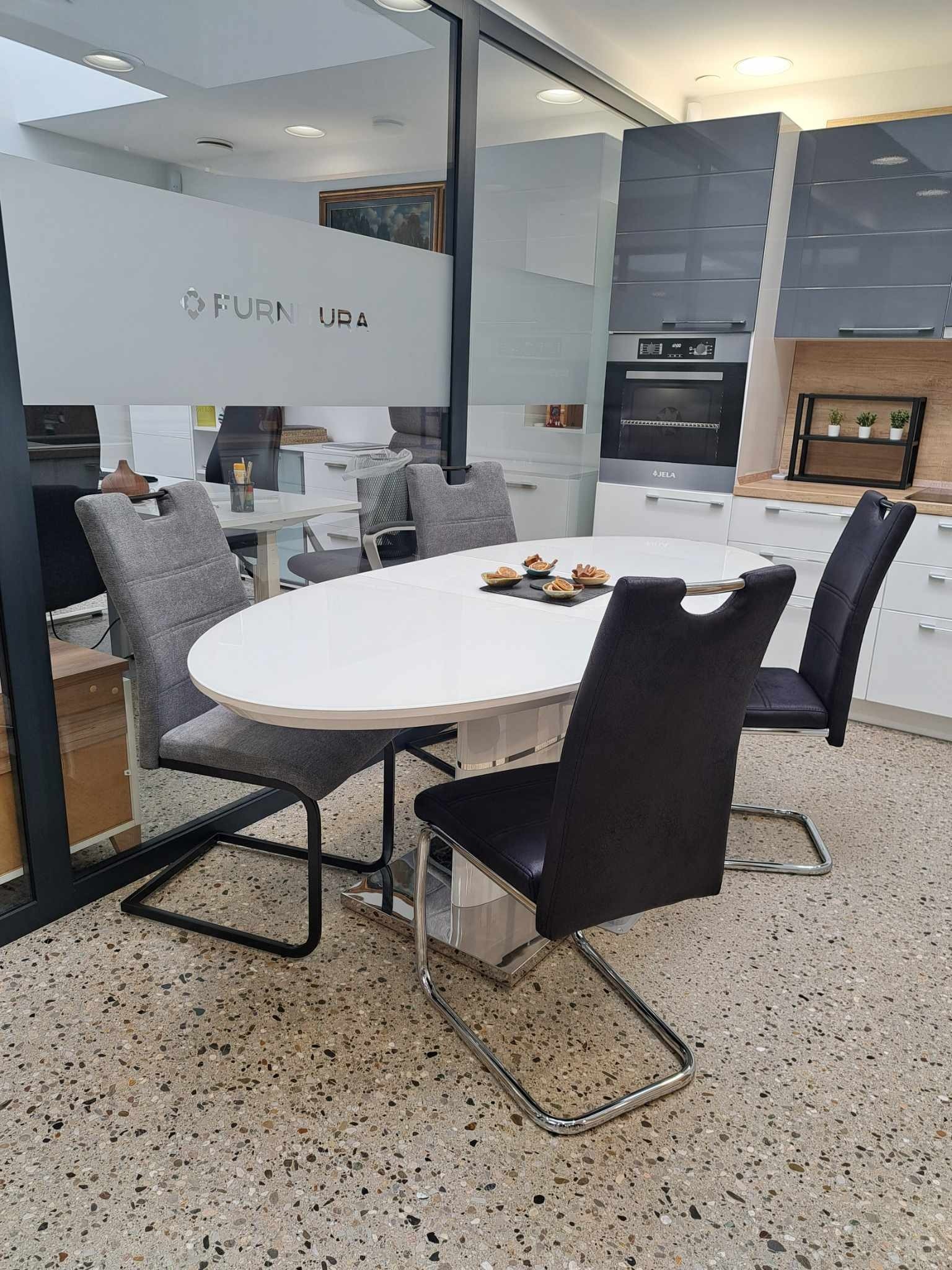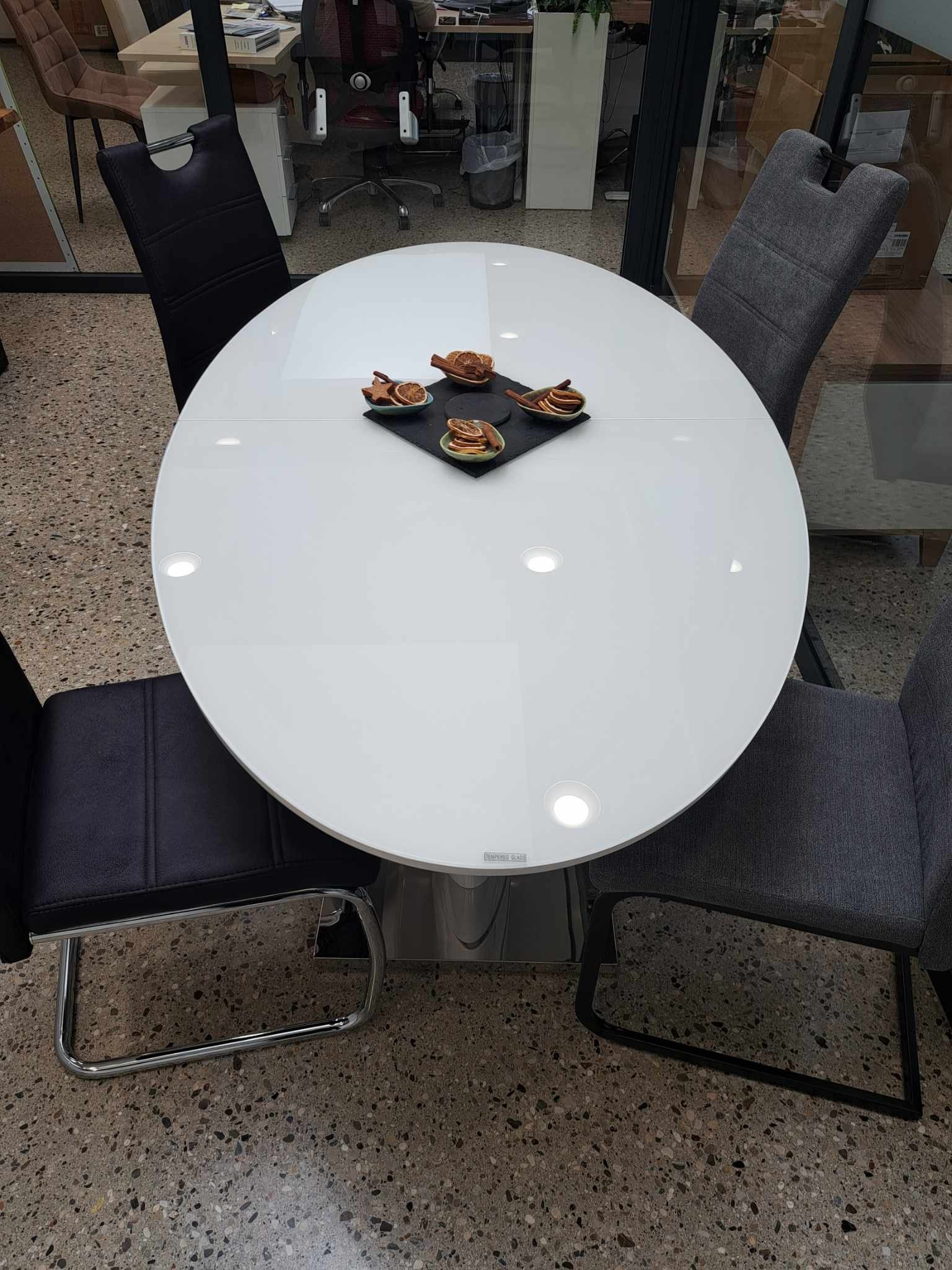 Opremite svoj dom z unikatnim jedilnim setom Moriarty, ki se ponaša z modernim dizajnom, funkcionalnostjo in udobjem. Set vključuje raztegljivo jedilno mizo, ki je še posebej priročna ko pride več nenapovedanih gostov, ter štiri nihajne stole v različnih barvah. Ročaj na vrhu hrbtišča vam omogoča lažje premikanje stolov, kvalitetna in mehka tkanina pa poskrbi za udobno sedenje v vseh letnih časih. Set je razstavljen v našem Showroomu v Ljubljani in je dobavljiv takoj! Na mizi je manjša poškodba, ki je nastala med transportom.