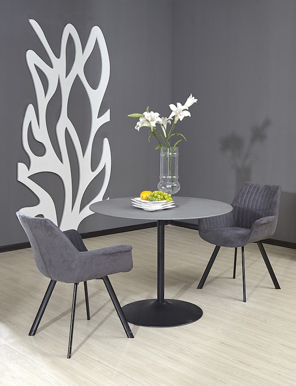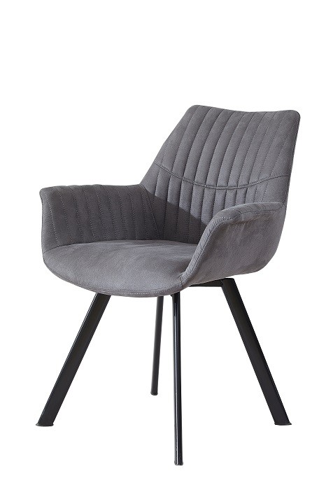 Jedilni stol ELIAS je z rokonasloni. Sedišče in hrbtišče sta oblazinjena s kvalitetno tkanino. Po hrbtišču in rokonaslonih je dekorativno prešitje. Ima funkcijo vrtenja. Višina sedišča je 62 cm. Podnožje je obdelano z prašnim lakiranjem v črni barvi.
