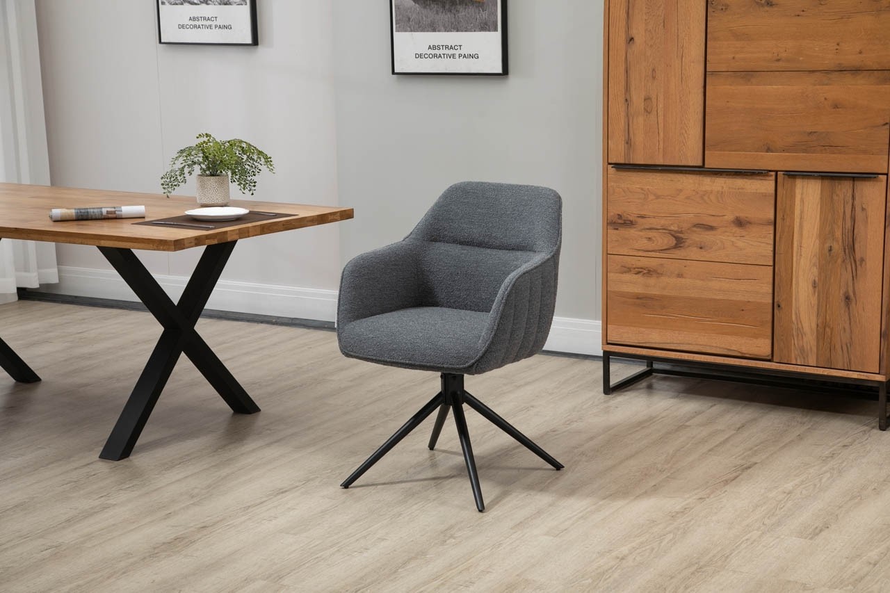 Estetski in udoben jedilni stol GLOBUS vsebuje široko sedišče, rokonaslone in pa funkcijo vrtljivosti, ki vam omogoča da stol zavrtite za 180°. Na voljo je v sivi barvi, ki se zaradi svoje nevtralnosti lepo poda v prav vsako kuhinjo. Celoten stol pa je oblazinjen v mehko tkanino. Maksimalna obremenitev znaša 120 kg. Podnožje je kovinsko in prašno lakirano v črno barvo za boljšo zaščito.