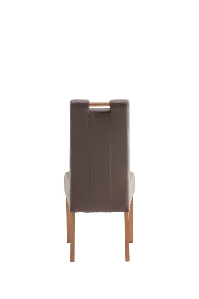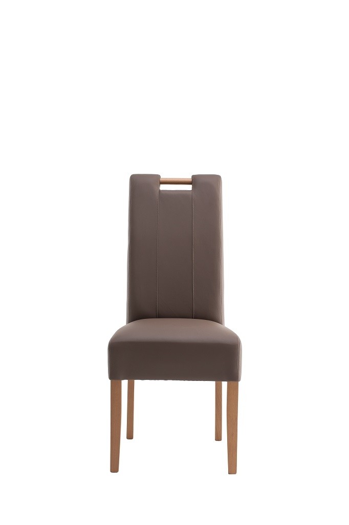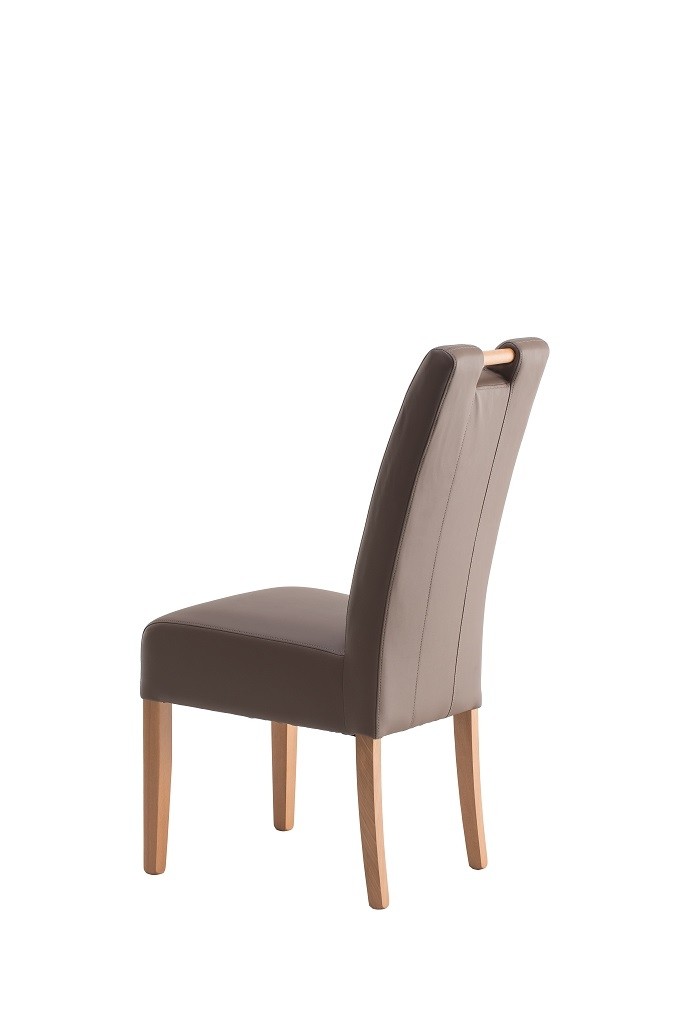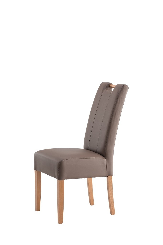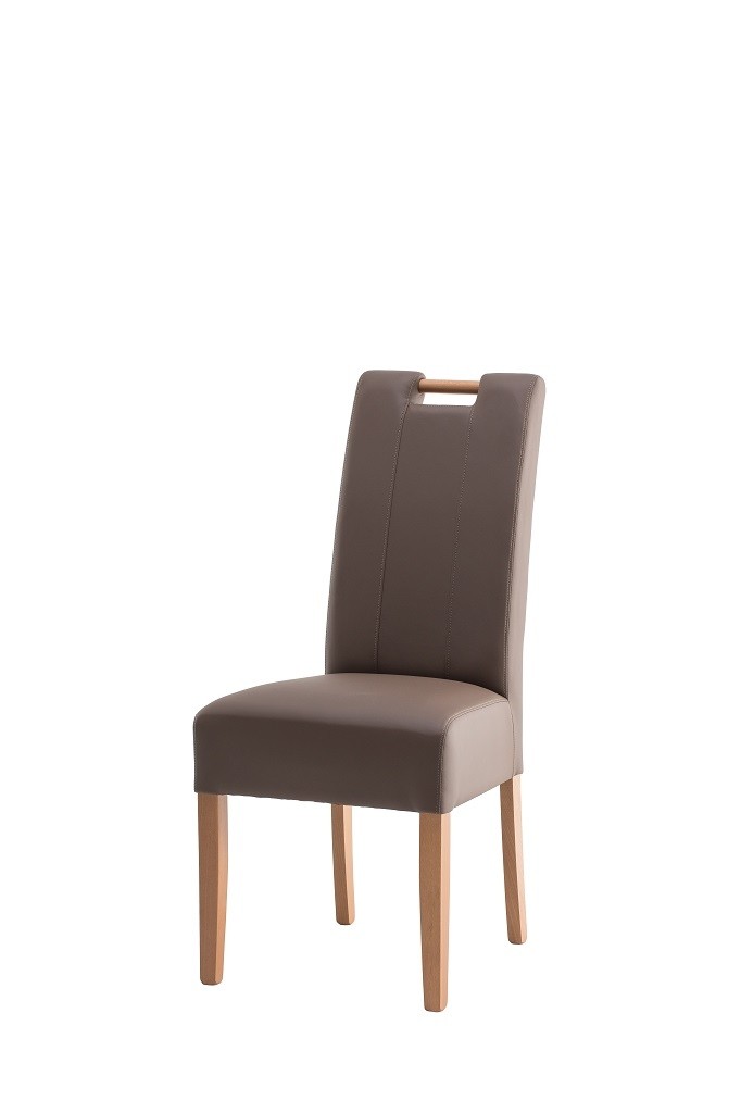 Jedilni stol NADYA oblazinjen v kvalitetno umetno PU usnje. Zgoraj ima nameščen lesen ročaj za lažje prenašanje. Sedišče je sestavljeno iz debele pene, ki zagotavlja dodatno udobnost stola. Skupna debelina sedišča je 19 cm. Noge so narejene iz masivnega bukovega lesa. Maksimalna obremenitev je 120 kg.