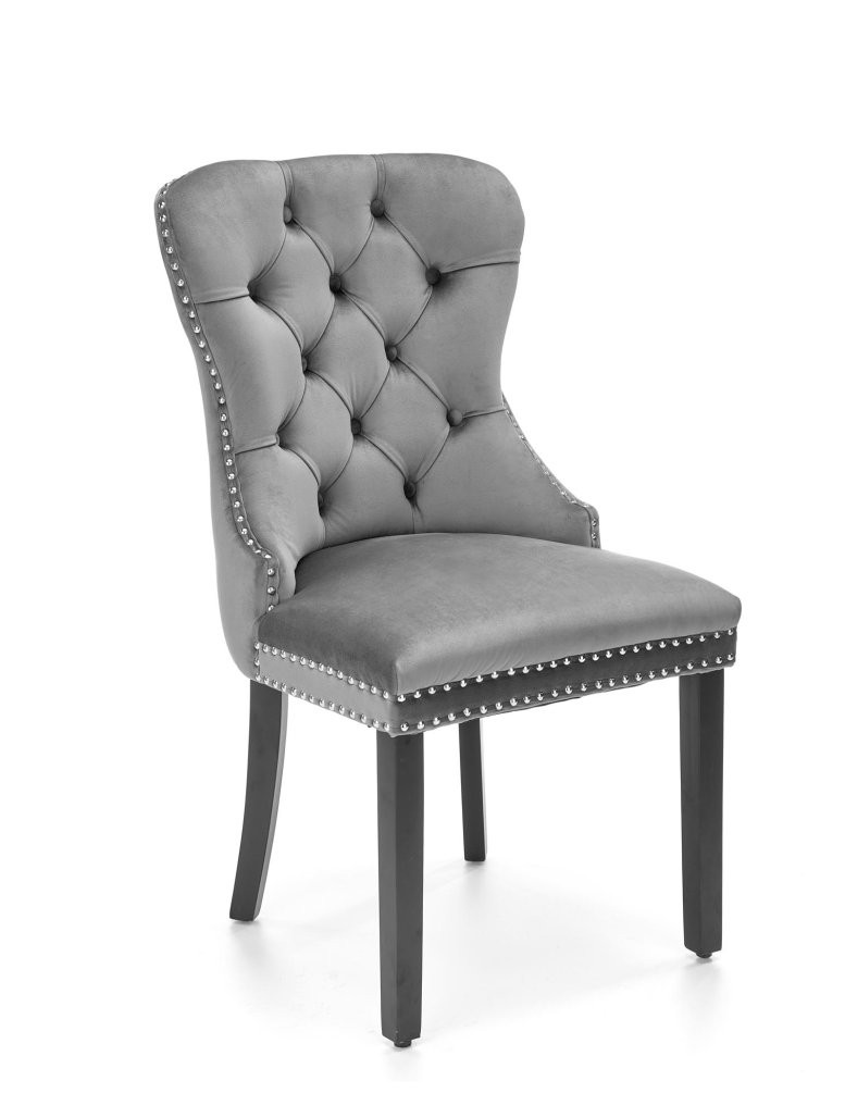 Jedilni stol Torl z masivnim lesom in žametnim oblazinjenjem v temno zeleni barvi. Klasičen in eleganten slog, s črnimi lesenimi nogami in nasloni za roke.