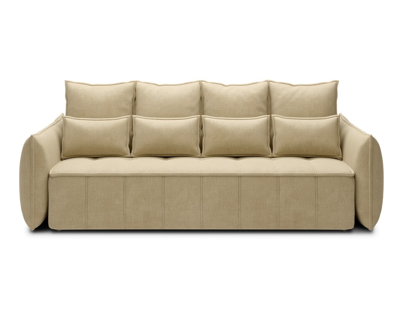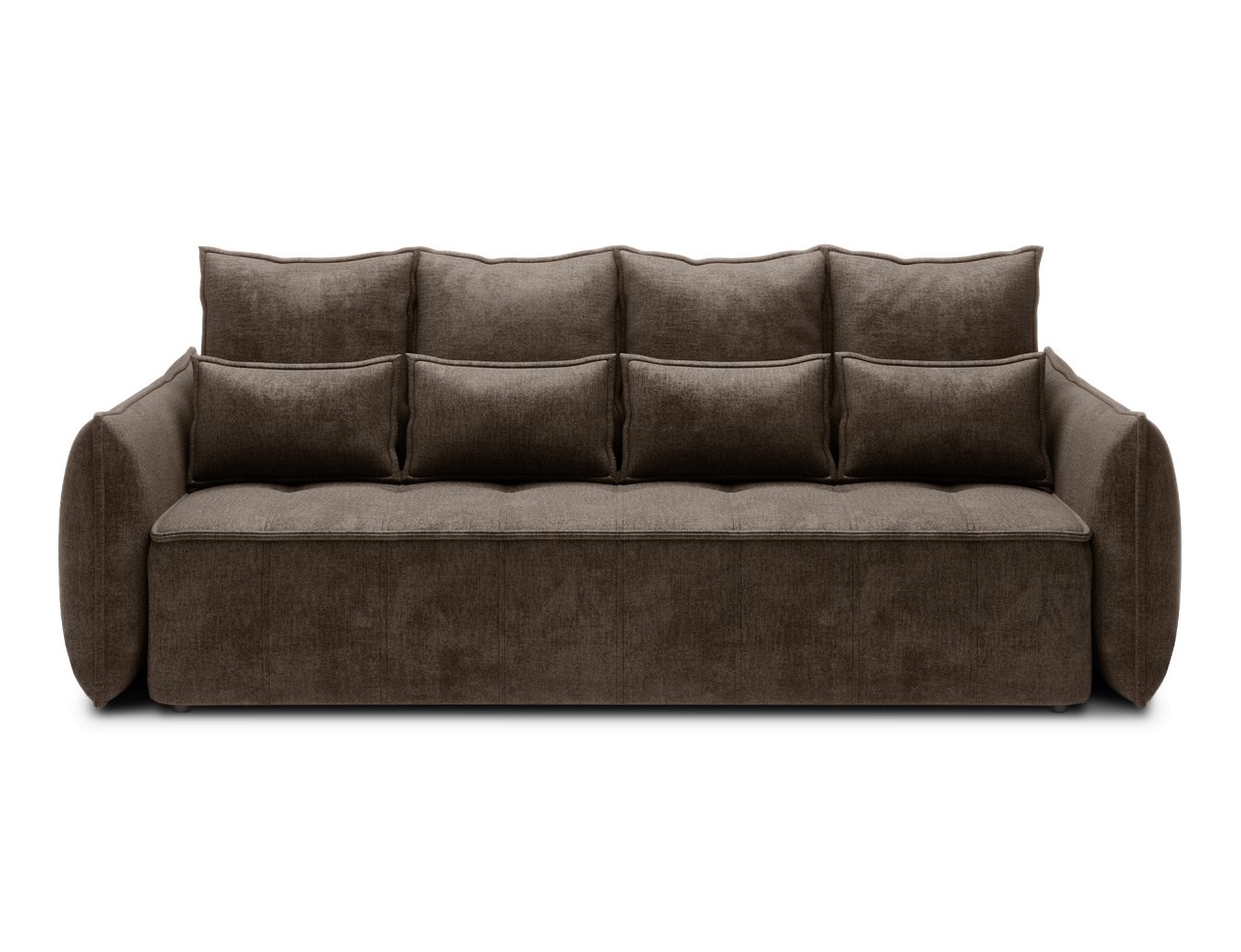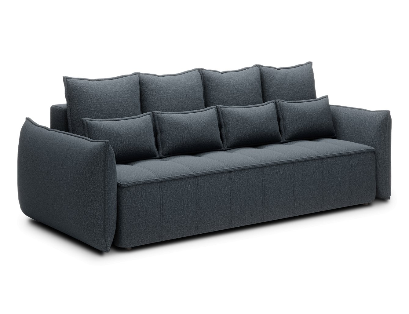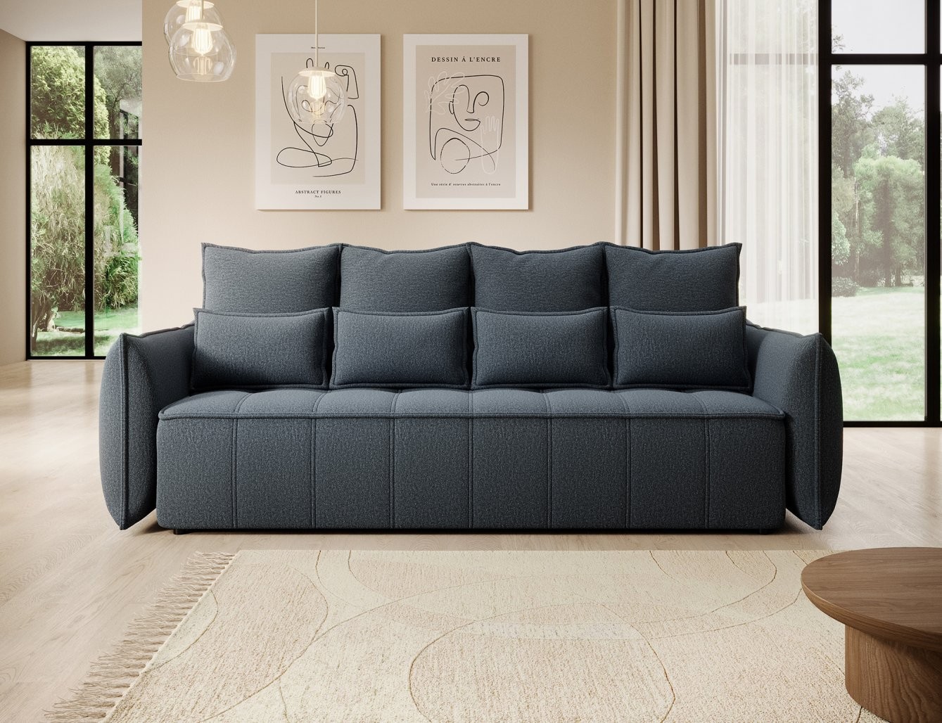 Sedišče je izdelano iz visokokakovostne HR (visoko prožne) poliuretanske pene, ki zagotavlja izjemno udobje in dolgotrajno vzdržljivost. Naslonjalo sedežne garniture je opremljeno z blazinami, polnjenimi s penastimi granulami, ki se popolnoma prilagodijo hrbtu in zagotavljajo maksimalno sprostitev. Dodatna prednost je prostor za shranjevanje posteljnine, ki omogoča priročno pospravljanje odej, vzglavnikov in drugih dodatkov, kar pomaga ohranjati red v vašem domu.