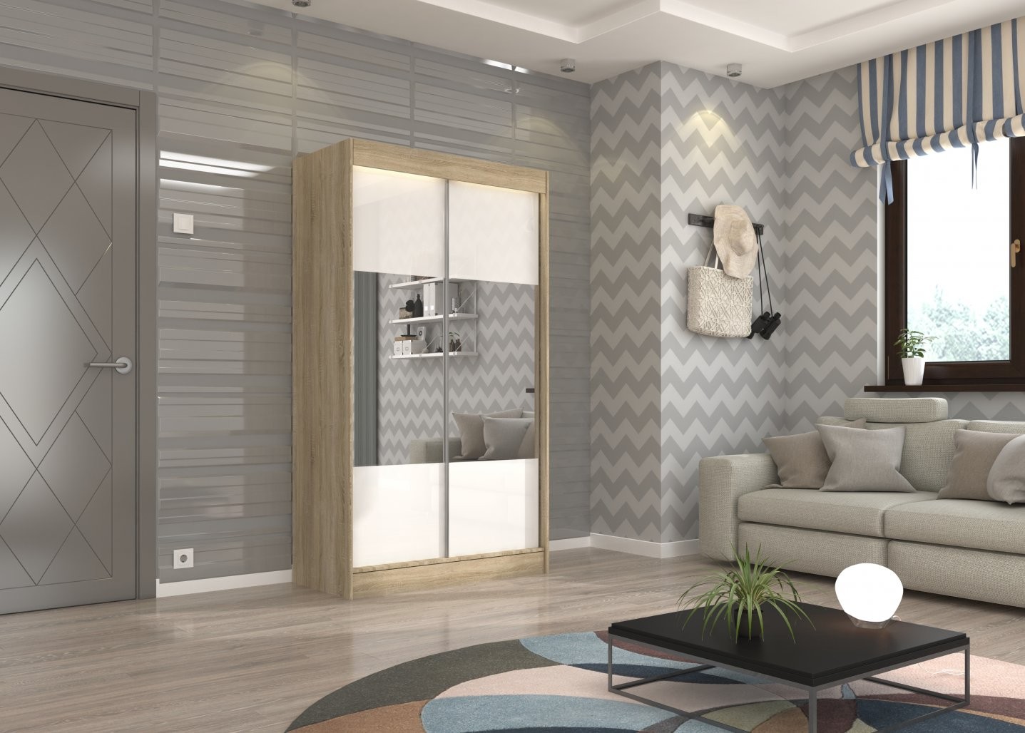 Elegantna zrcalna površina in steklo Lacobel dodata prostoru pridih prefinjenosti, medtem ko prostorne police in palici za obešanje omogočajo optimalno shranjevanje vaših oblačil.