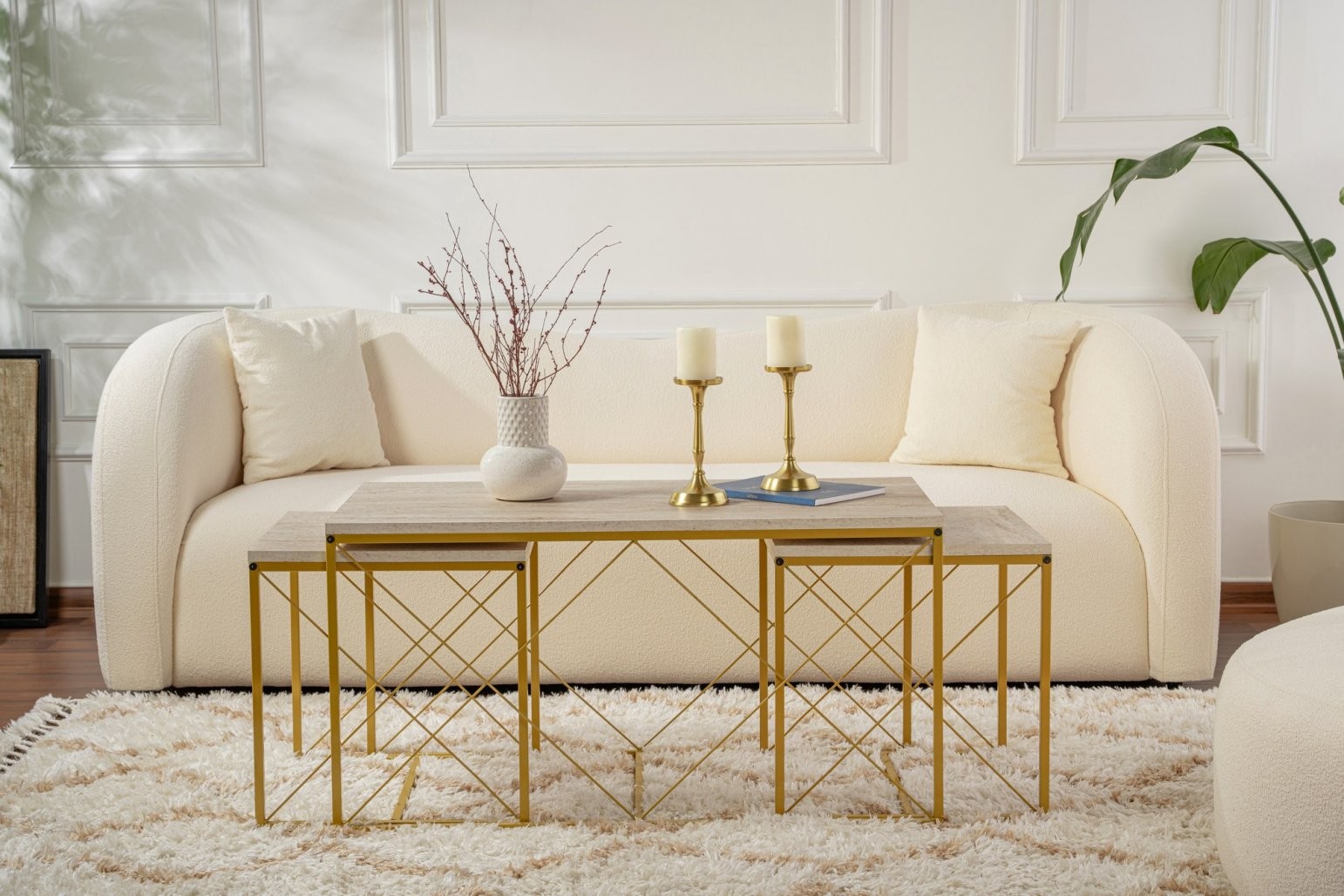 S svojo osupljivo garnituro mizic iz marmorja izboljšajte svoj dnevni prostor. Ta izvrsten komplet izžareva eleganco in prefinjenost, zato je popoln dodatek za vsak sodoben dom. Razkošna marmorna obdelava v kombinaciji z elegantnimi zlatimi kovinskimi nogami ustvarja eleganten in eleganten videz, ki bo navdušil vaše goste in izboljšal ambient vaše dnevne sobe.