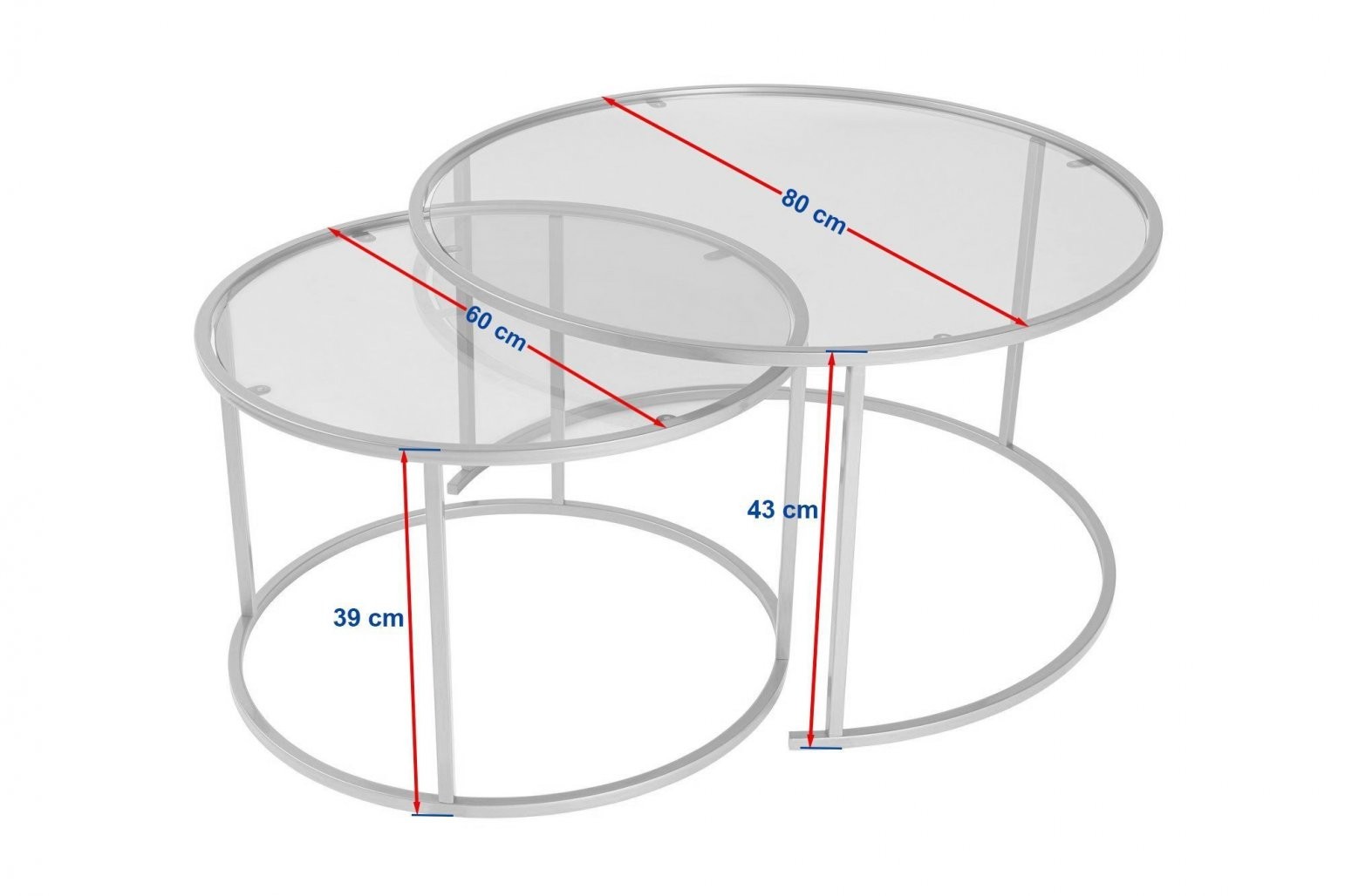 Set vključuje majhno in veliko mizo, obe z elegantnim in minimalističnim dizajnom, ki bosta dopolnili vsak dekorativni slog. Majhna miza meri 60 cm v širino, 39 cm v višino in 60 cm v globino, medtem ko velika miza meri 80 cm v širino, 43 cm v višino in 80 cm v globino.