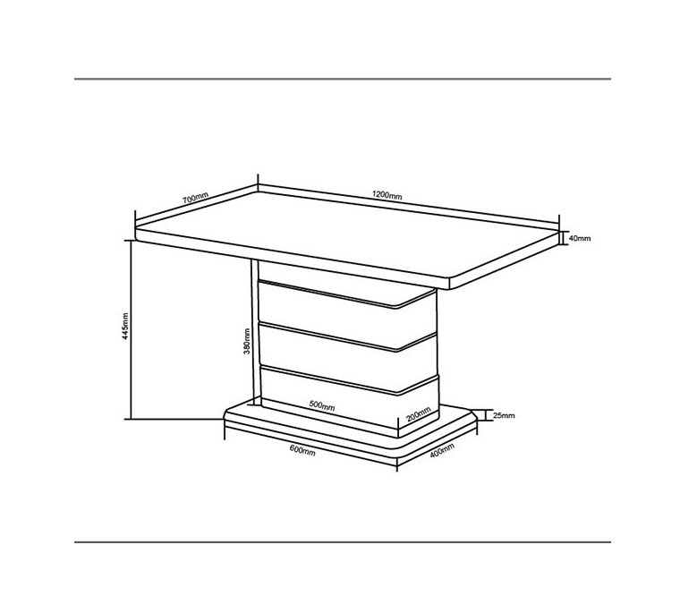 Miza je v celoti izdelana iz kvalitetnega MDF materiala in ima nosilnost 50 kg. Zgornja plošča je debeline 3,5 cm, spodnja pa 2,5 cm.