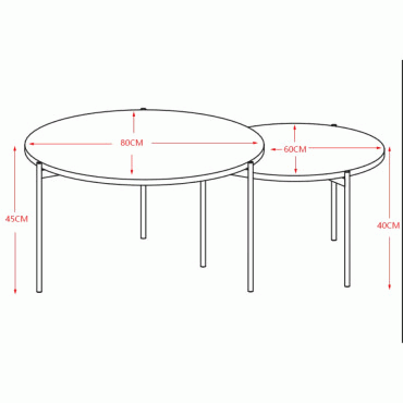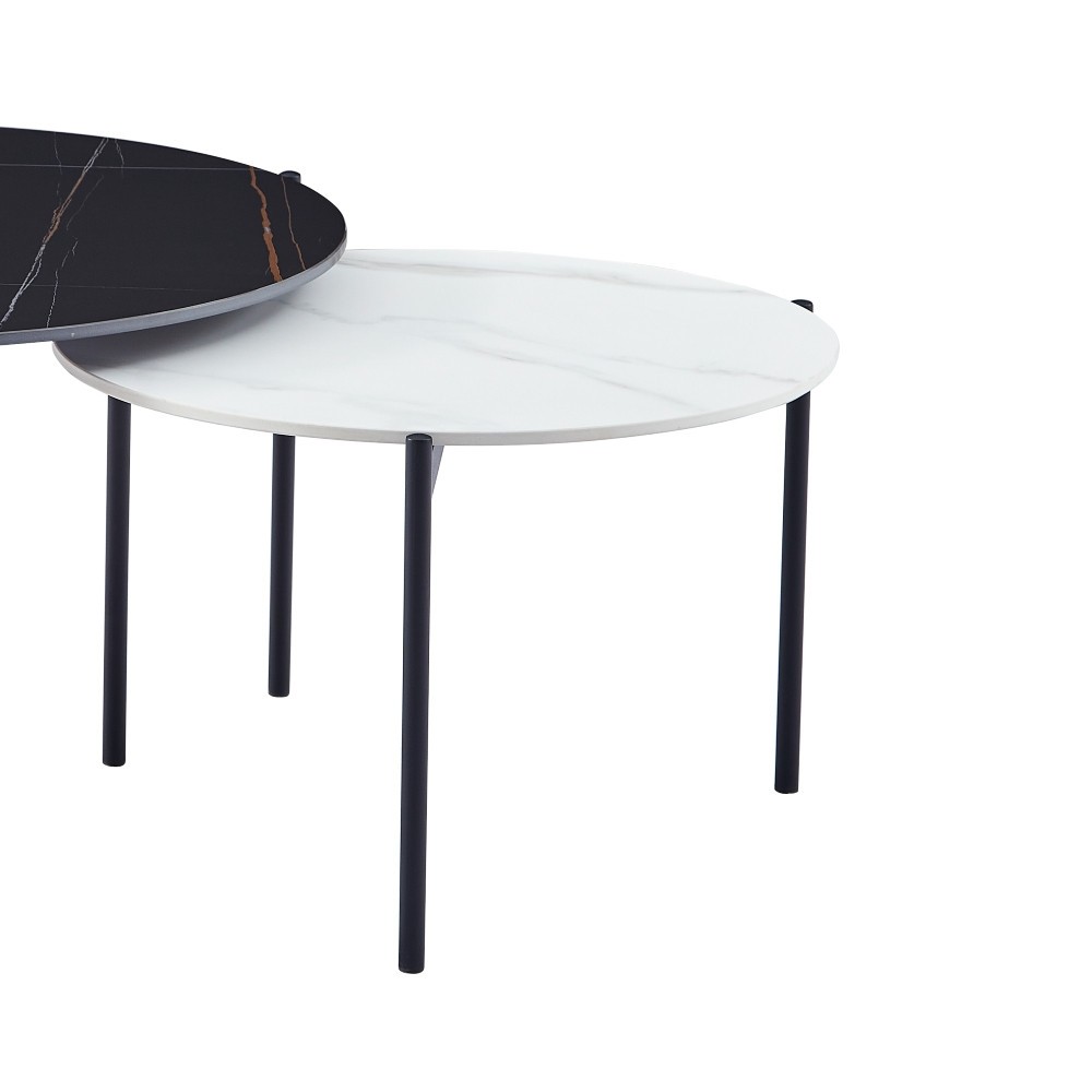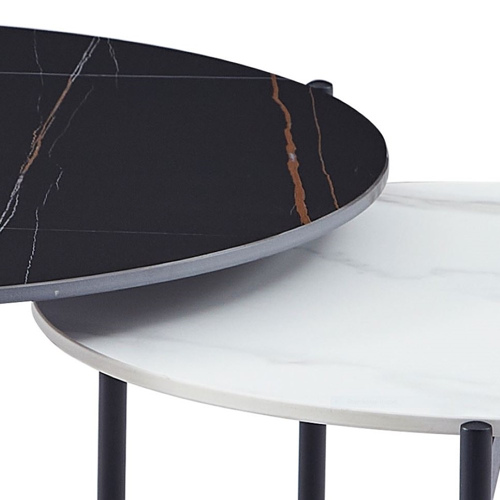 Set dveh klubskih miz okrogle oblike, pri katerem je manjša miza v barvi belega marmorja, večja pa v barvi črnega marmorja z zlatimi okrasnimi črtami. Kombinacija obeh barv poživi vaš prostor. Omogoči hitro povečanje prostora, saj v primeru, da ne potrebujete obeh miz, lahko manjšo pospravite pod večjo mizo in tako pridobite prostor. Mizi sta narejeni iz sintranega kamna, ki je veliko boljši od navadne keramike in je zato tudi težje lomljiv. Dodatna kakovost tega materiala pa je odpornost na vročino in mraz. Obe mizi imata noge narejene iz kovine in sta polakirani za boljšo zaščito.