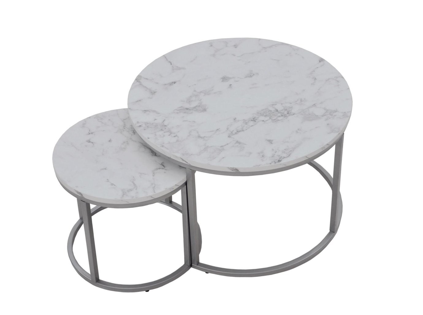 Klubska mizica Anel s pridihom klasičnega prestiža. Dva mizica z marmornato površino in srebrnimi nogami iz prašno lakiranega jekla, ki ustvarjata prefinjen in eleganten videz.