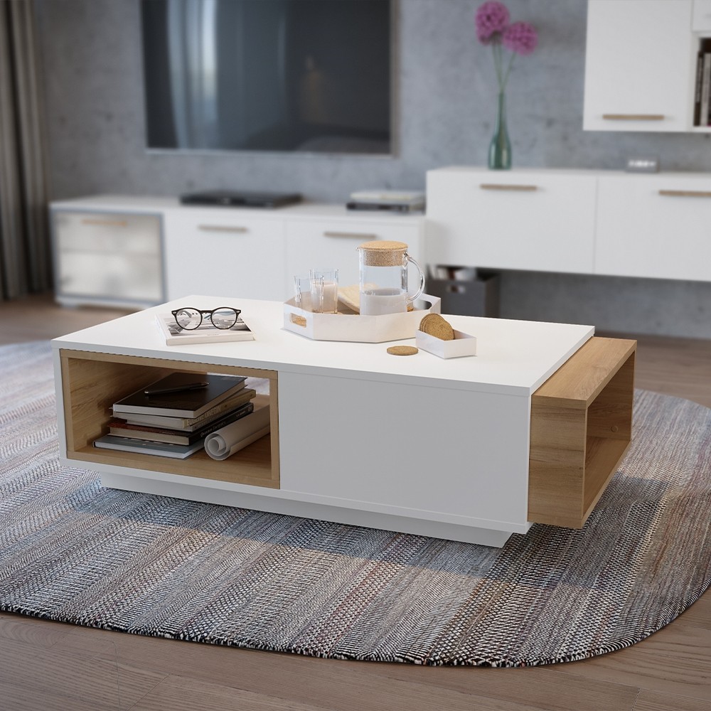 Privoščite si privlačno in predvsem zelo praktično klubsko mizico iz kolekcije ARC. Mizica je na voljo v beli mat lak barvi, vsebuje polico in manjšo izvlečno mizico, ki jo povlečete iz elementa in tako ustvarite dodaten shranjevalni prostor za večje stvari.