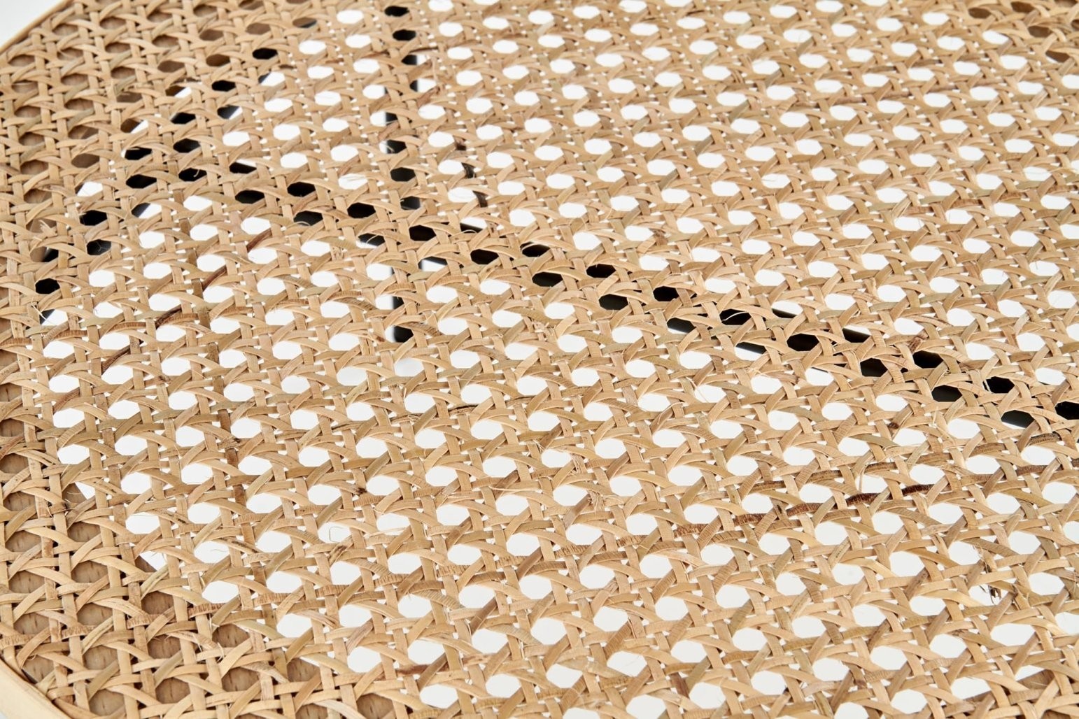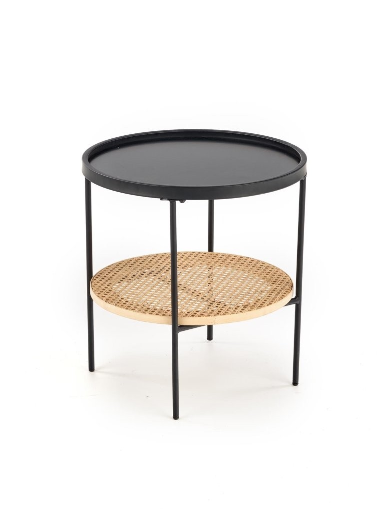 Klubska mizica Aril s kroglo zgornjo ploščo iz naravnega ratana in MDF materiala. Dodatne spodnje police in črno kovinsko ogrodje za eleganten in praktičen dizajn v skandinavskem slogu.