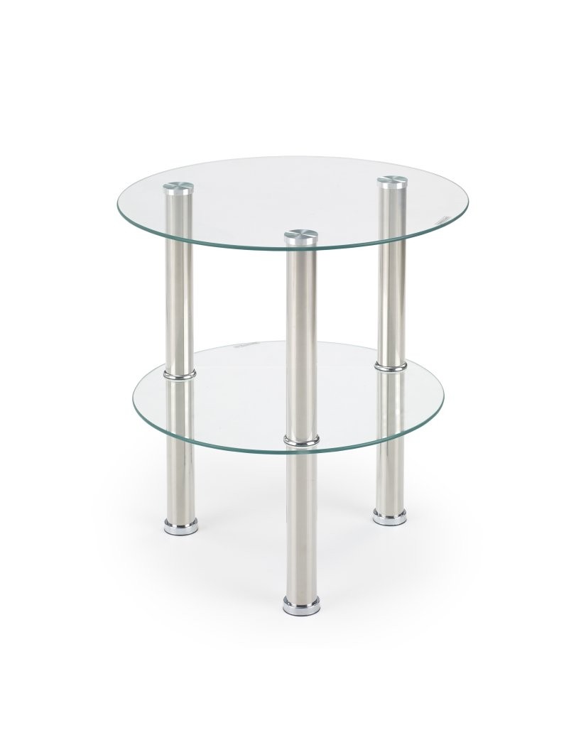 Klubska mizica Blorn z okroglim steklenim vrhom in kovinskim okvirjem v srebrni barvi ponuja sodoben dizajn. Idealen dodatek za moderno dnevno sobo.