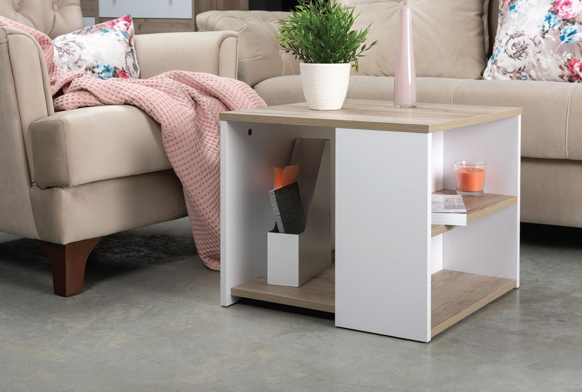 Moderna klubska mizica DASA 2 ima eno veliko in dve manjši polički, kamor lahko odložite razne revije, časopise, knjige za goste in razne dekorativne predmete. Na voljo je v moderni barvni kombinaciji bele barve in sivega hrasta, ki se odlično poda z ostalimi barvami.