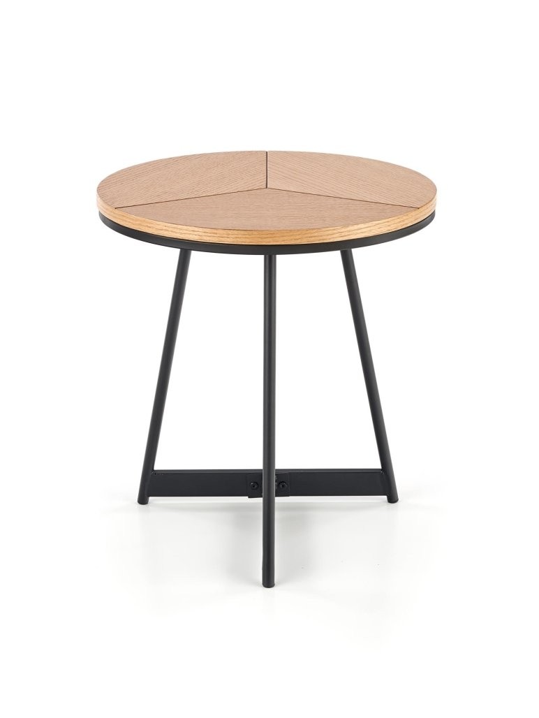 Klubska mizica Dran z manjšim premerom, okrogla zgornja plošča iz furnirja in črno kovinsko ogrodje. Dodatek k minimalističnim prostorom v naravnem industrijski stilu.
