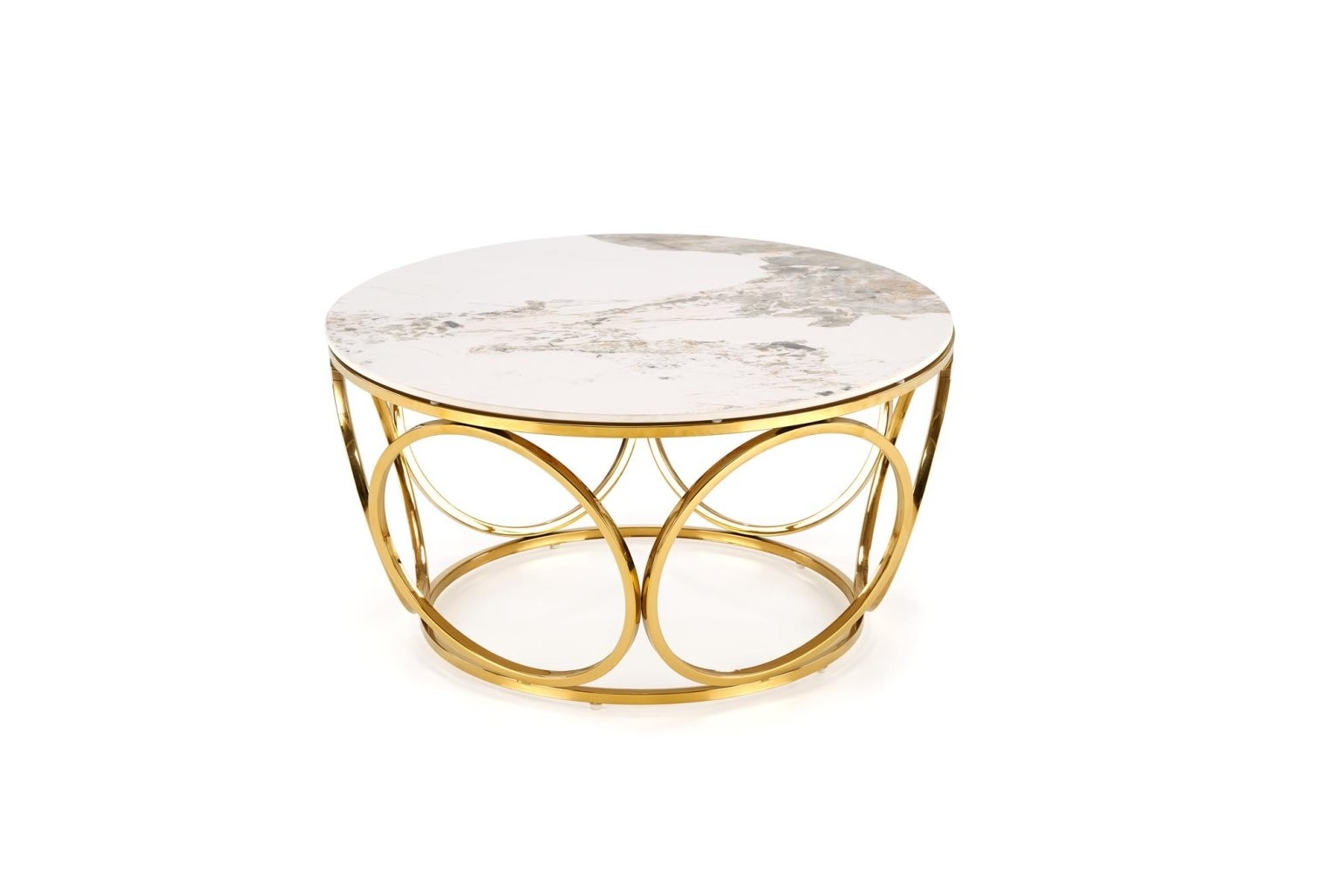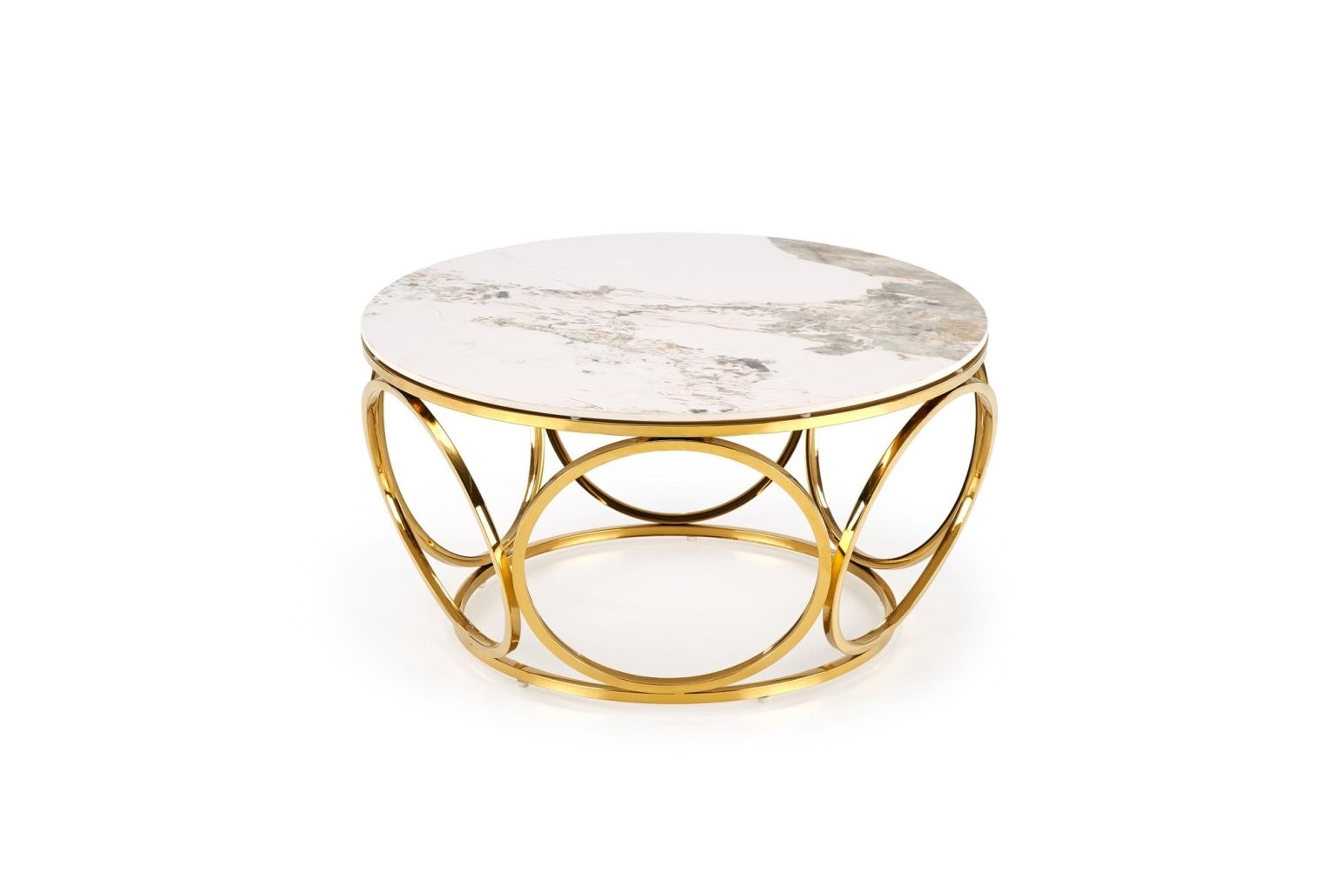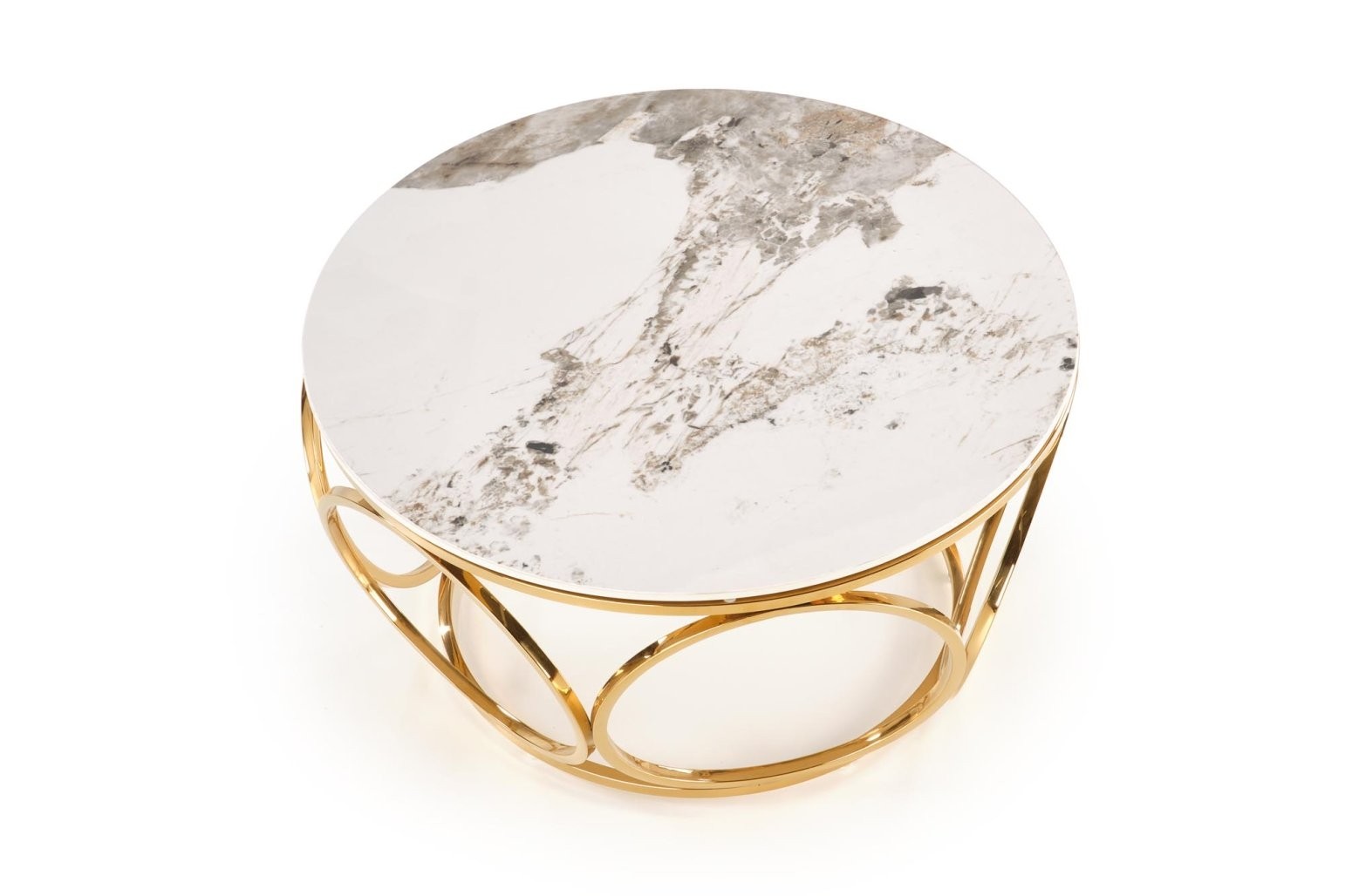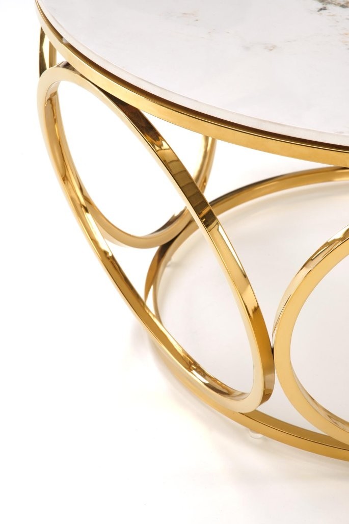 Klubska mizica Farlo z okroglo površino iz sintranega kamna, v beli marmornati barvi. Z zlatimi kovinskimi nogami prinaša eleganco v modernem prostoru.