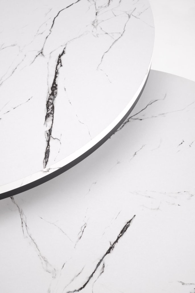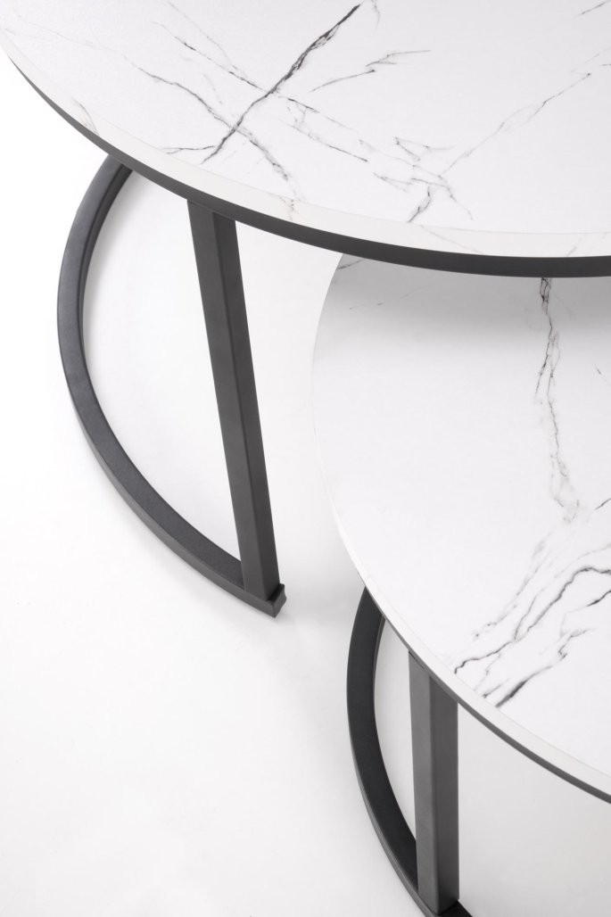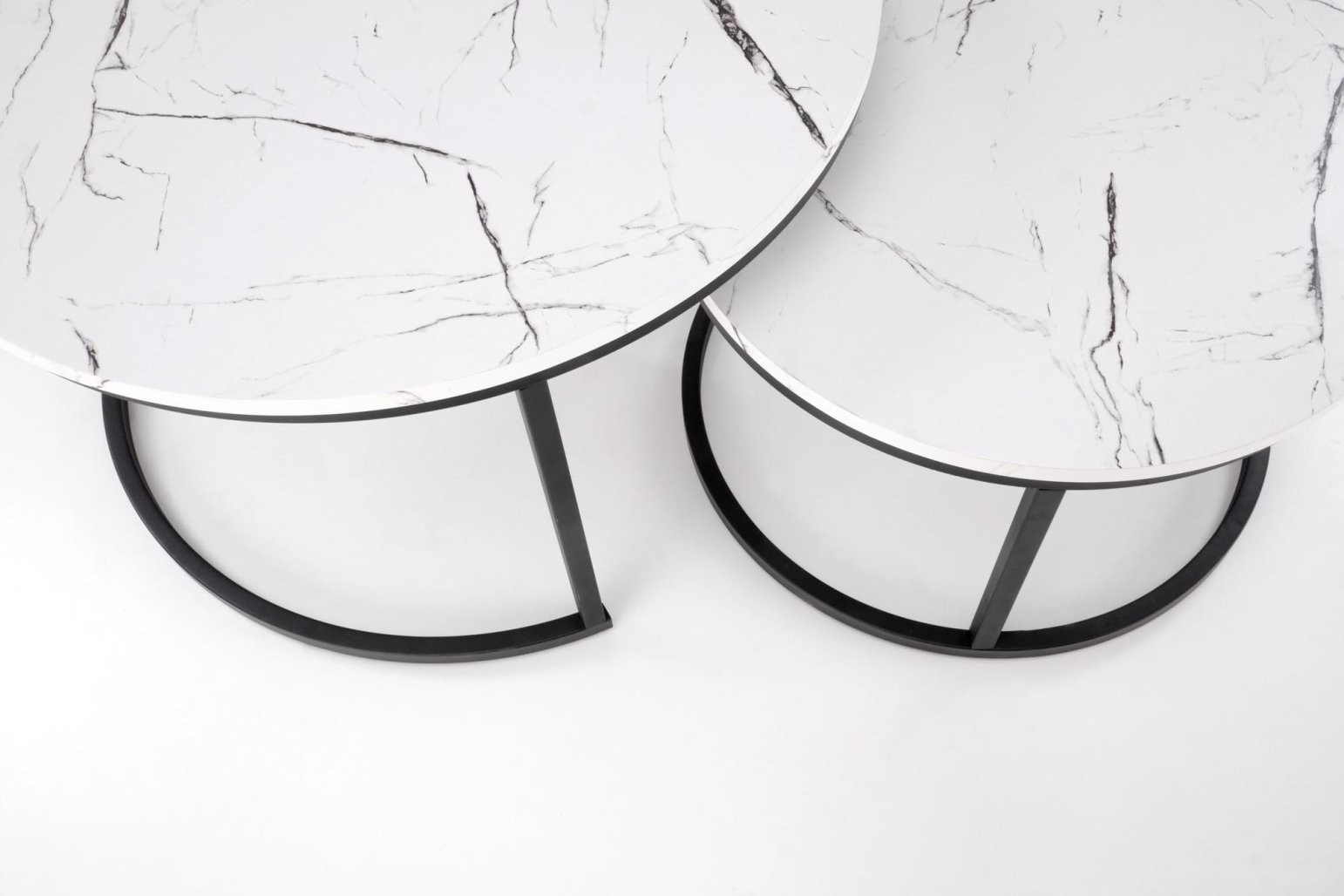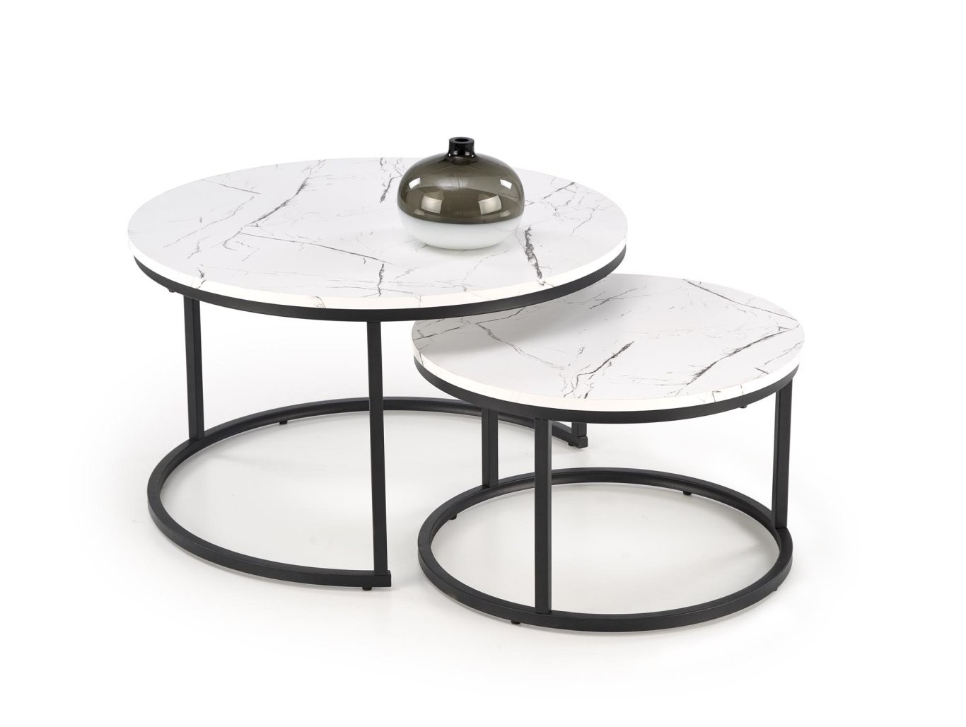 Klubska mizica Halron je set dveh miz s črnim kovinskim okvirjem in MDF ploščo v imitaciji belega marmorja. Eleganten dodatek za sodobno dnevno sobo.