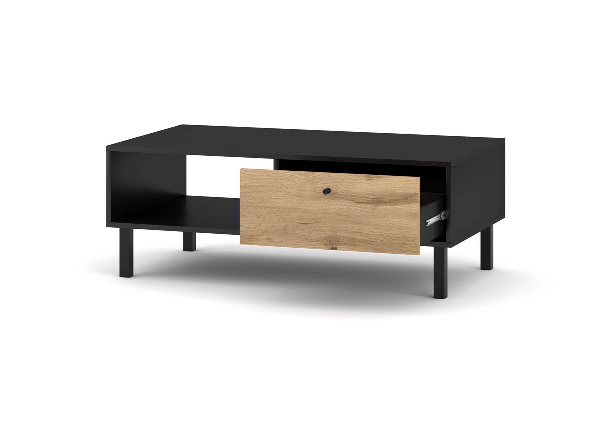 Klubska mizica JATOK je preprosta vendar modernega izgleda. Njena elegantna kombinacija hrasta in črne barve vas bo navdušila že ob prvem pogledu. Klubska mizica vsebuje predal in odlagalno površino za revije, knjige ali družabne igre.