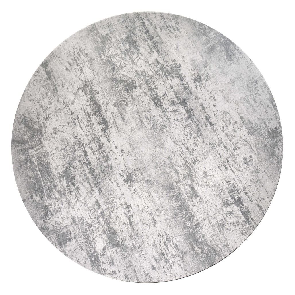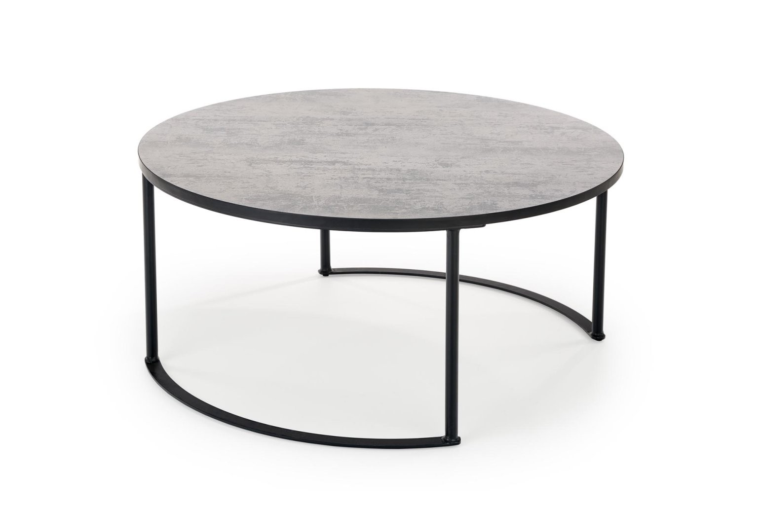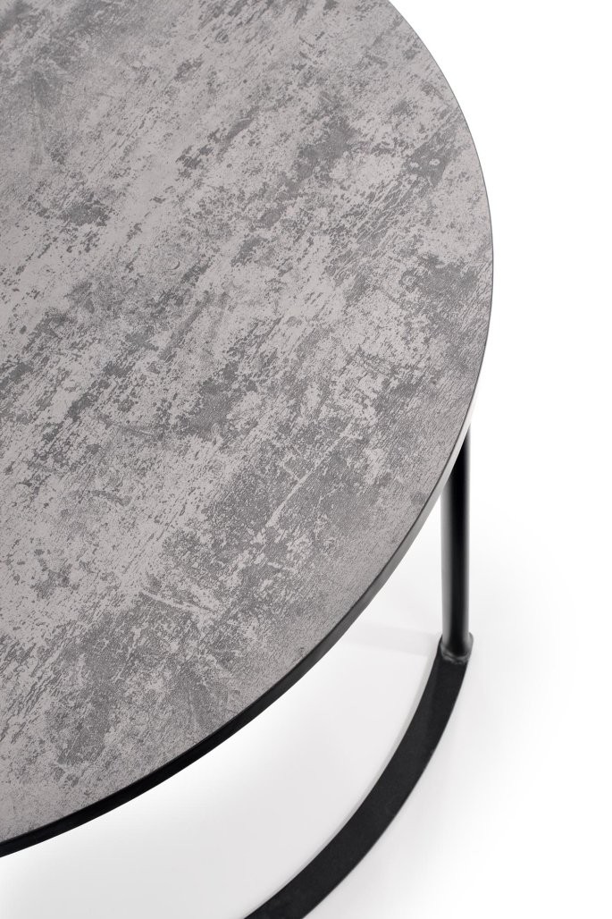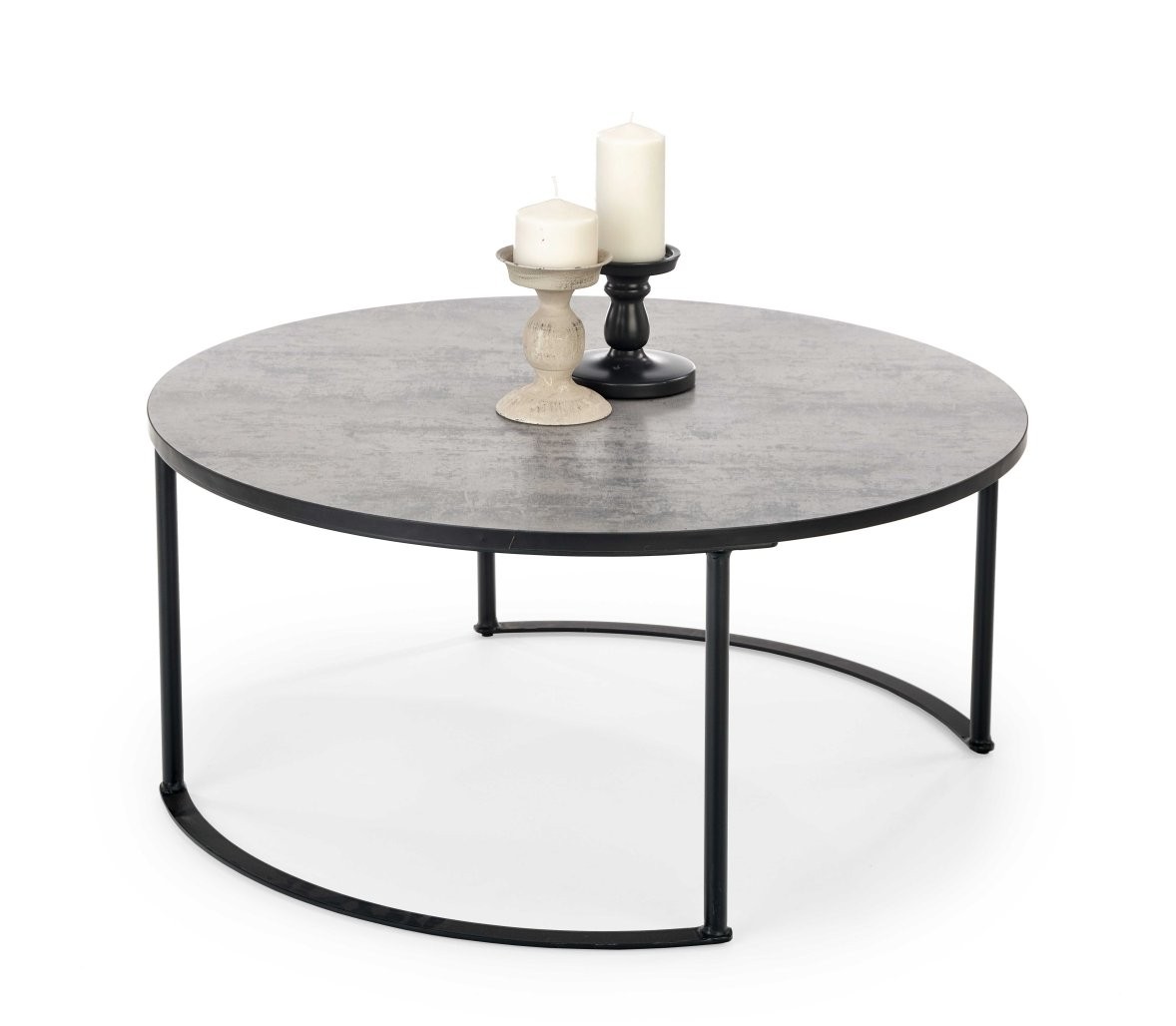 Klubska mizica Jilo z okroglo ploščo iz sivega melamina in črnim kovinskim okvirjem. Sodobna in preprosta oblika, ki se lepo poda v vsak sodoben ali industrijski ambient.