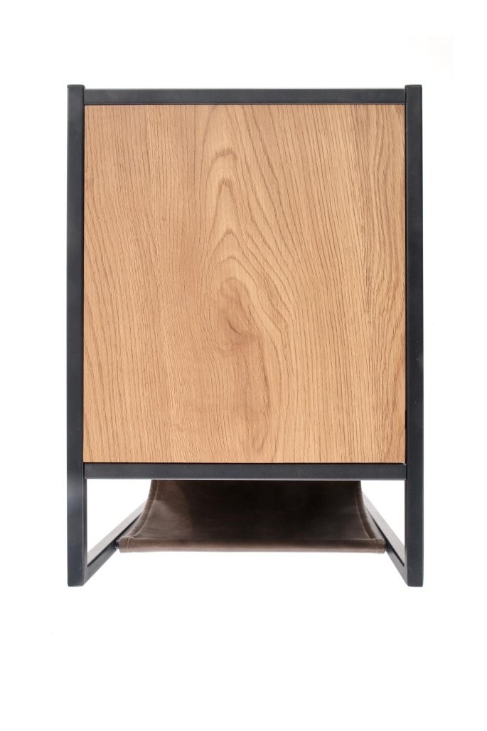 Klubska mizica Jolon z dimenzijami 47 x 33 x 65 cm, izdelana iz laminiranega MDF-a in umetnega usnja v barvi zlatega hrasta in črne barve. S funkcijo za shranjevanje časopisov.