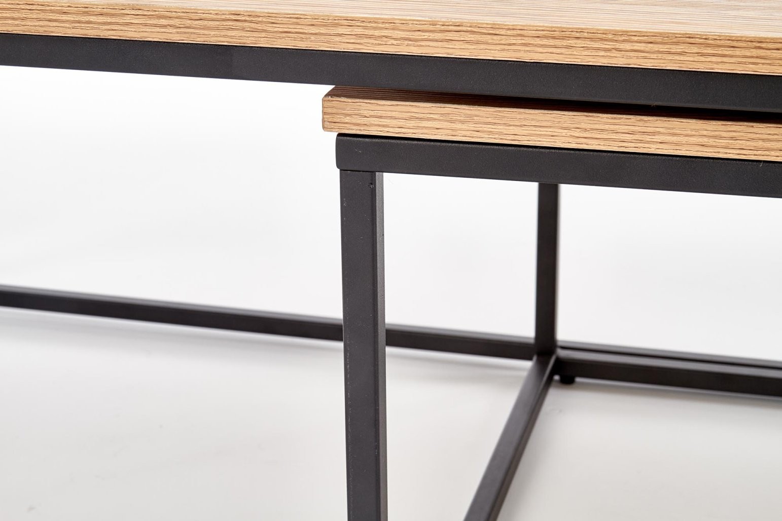 Klubska mizica Joren ima črn kovinski okvir in MDF ploščo v barvi zlatega hrasta. Pravokotna oblika dodaja funkcionalnost in pridih modernosti v različne prostore.