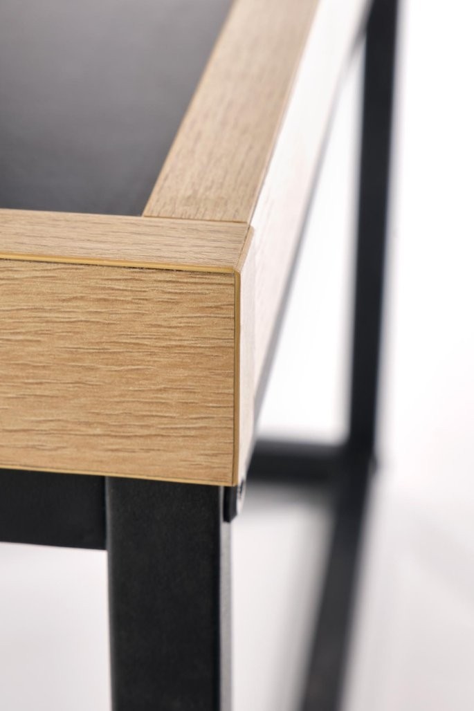 Klubska mizica Kelen s pravokotno ploščo iz laminiranega iverala, v naravnem odtenku in črni barvi. Poudarek na skandinavskem in industrijski slogu z robustnimi kovinskimi elementi.