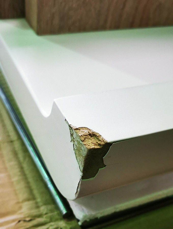 Izdelek je nov, zaradi napake pri transportu, pa ima poškodbe na robovih zgornje plošče. Slike v galeriji.
