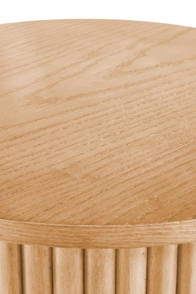 Klubska mizica Lelon v boho in skandinavskem slogu. Izdelana iz masivnega lesa z naravno furnirano mizno ploščo. Premer 80 cm, višina 41 cm.