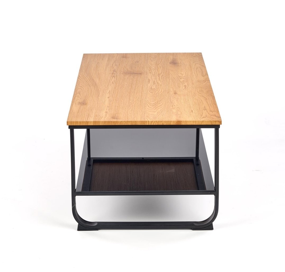 Klubska mizica Olara s pravokotno površino v zlato hrastovem videzu in črnim kovinskim okvirjem dodaja pridih industrijskega sloga. Spodnja polica nudi dodaten prostor za shranjevanje revij.