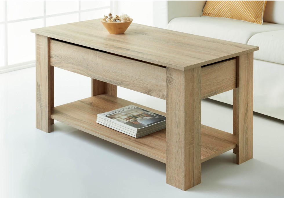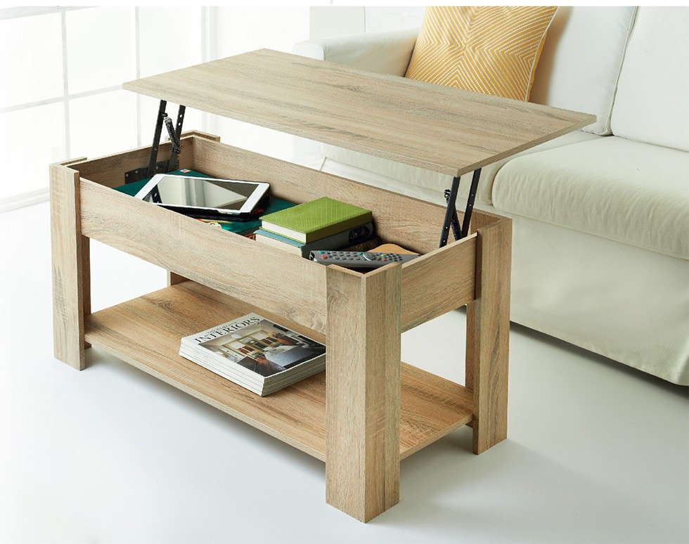 Klubska mizica OLIN je zelo priročna in funkcionalna, saj ima dvižno ploščo in pod njo predal za shranjevanje.